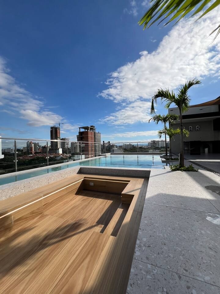 Njóttu glæsileika og þæginda í íbúðinni okkar á besta svæði Santa Cruz. Þetta nútímalega rými býður upp á 50"sjónvarp, háhraða þráðlaust net og aðgang að ótrúlegum þægindum: sundlaug, heitum potti, sánu, líkamsrækt, leikjaherbergi, churrasqueras og kvikmyndahúsum. Skref í burtu frá veitingastöðum, börum og verslunarmiðstöðvum er þetta tilvalinn valkostur fyrir þá sem eru að leita sér að einstakri gistingu. Bókaðu núna og upplifðu einstaka lúxus og þægindi!