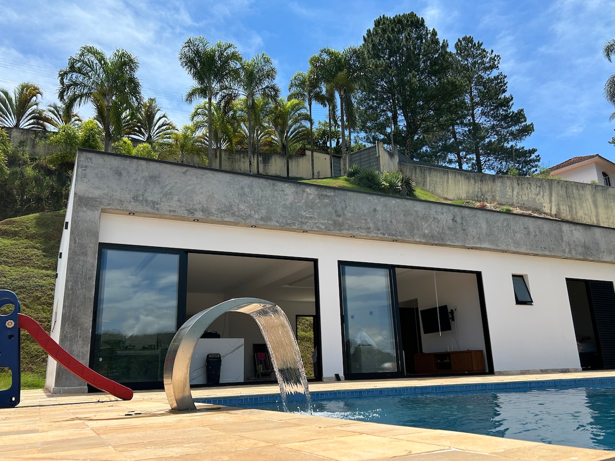 Conheça @bonihouse.airbnb Venha relaxar neste espaço calmo e cheio de estilo perto de SP e apenas 1 pedágio pela Fernão dias. Fuja da correria de SP, tenha privacidade, calmaria e traga seu pet's para correr na grama. Eles merecem tá 🐶 e não cobramos taxas adicionais Relaxe no ofurô, divirta-se com os amigos na sinuca, fliperama, jogos de tabuleiro ou na beira da fogueira ao anoitecer. O mergulho na piscina com aquecimento solar é imprescindível!