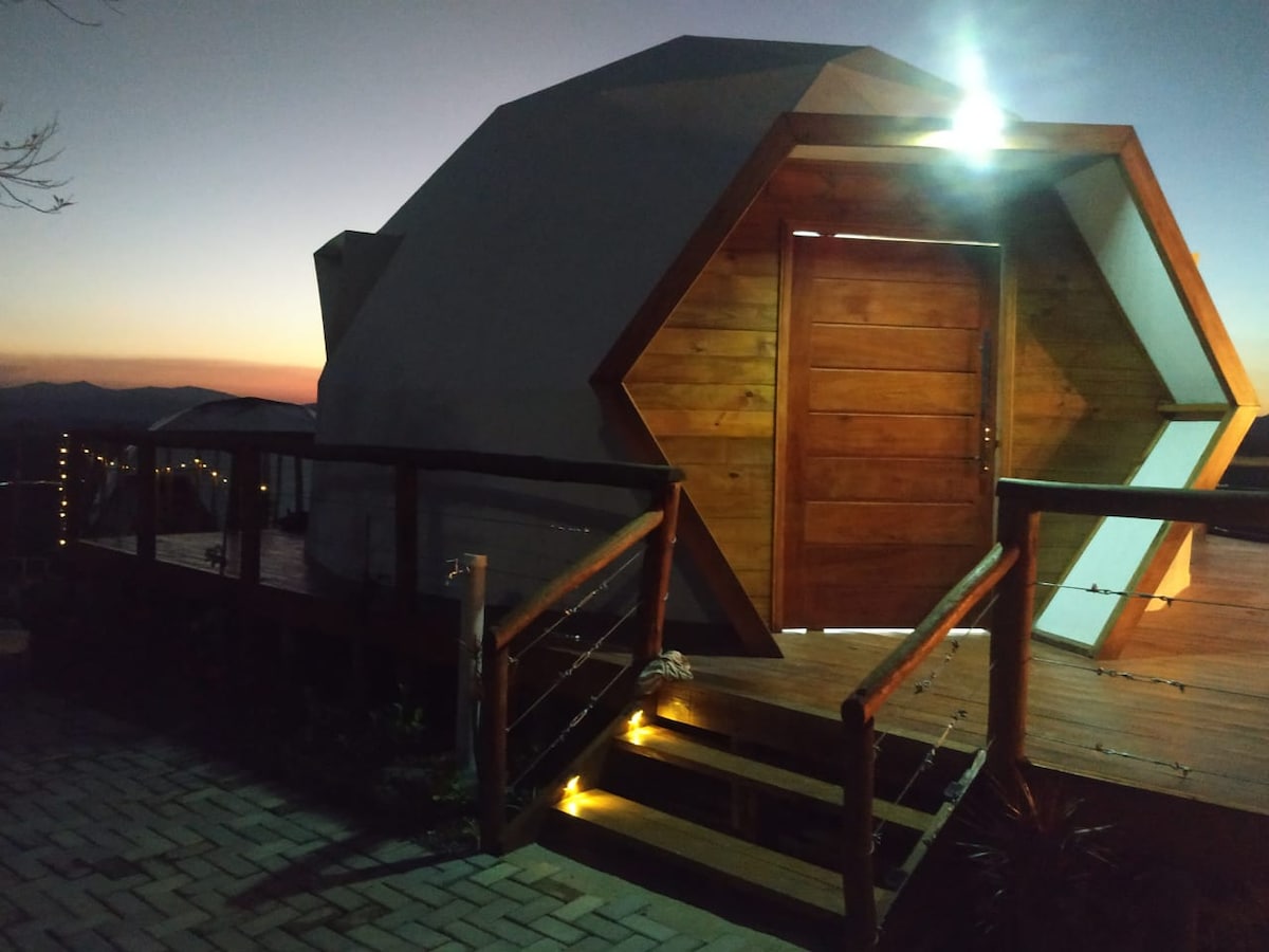Velkomin í þetta heillandi hvelfingu sem hefur verið úthugsað til að bjóða upp á friðsælt og rómantískt frí fyrir íbúa sína. Staðsett í hlíð og býður upp á yfirgripsmikið útsýni yfir vatnið og fjöllin. Hvelfingin er með stórum gluggum sem bjóða upp á náttúrulega birtu til að lýsa upp umhverfið. Það er skreytt með mjúkum, stílhreinum tónum og býður upp á lúxus Queen-size rúm með rúmgóðum heitum potti og stóra útiveröndin er fullkominn staður fyrir rómantíska kvöldverði við sólsetur.