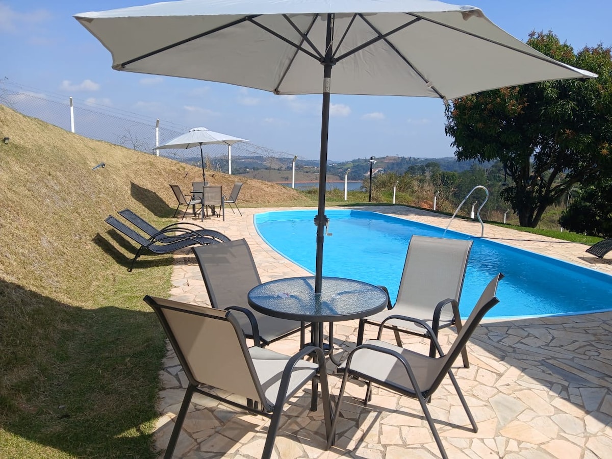 Leve toda a família a este ótimo lugar com muito espaço para se divertir. Local ventilado com 3 quartos, 4 banheiros *Roupas de cama e banho limpas e de qualidade* , sala, cozinha, varanda,lareira, uma garagem Área gourmet com churrasqueira, fogão a lenha, mesa sinuca, piscina climatizada solar, garagem para 4 carros , sendo uma coberta. Pomar, horta, flores, junto a natureza com vista deslumbrante da represa do Rio Jaguari.