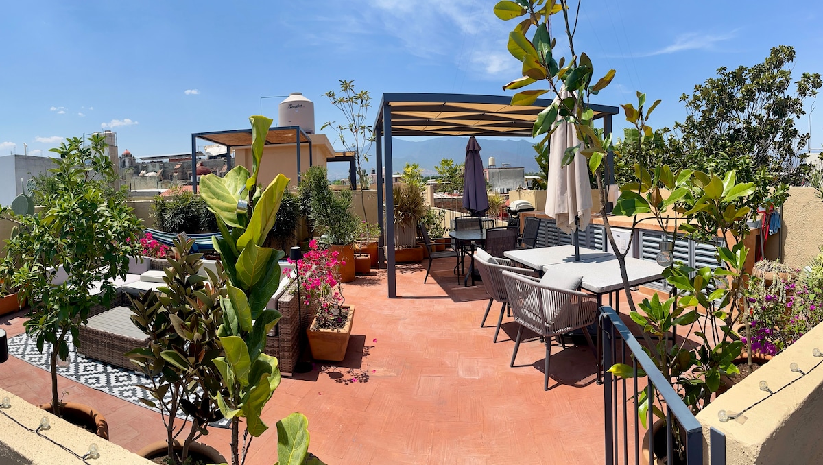Glæsileg íbúð með upprunalegri Oaxacan-list. Staðsett í miðju alls, nokkrum götum frá zocalo borgarinnar og hinu fræga Jalatlaco-hverfi. Frá staðsetningu okkar getur þú kynnst öllum áhugaverðum stöðum sem miðborgin býður upp á fótgangandi. Nálægt veitingastöðum, kaffihúsum og mörkuðum. Auk þess er gistiaðstaðan okkar með glæsilegu og vel búnu einkaþaki þar sem þú getur kunnað að meta útsýni yfir borgina.