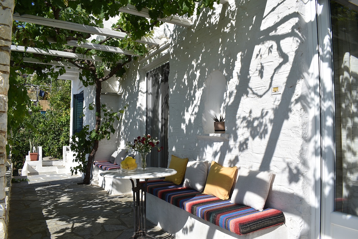 Hefðbundna hringeyska steinhúsið okkar (65 fermetrar) er staðsett í miðju þorpinu og þar er dásamlegur garður með sítrónu, appelsínugulu, granatepli, apríkósutrjám, avókadó og vínberjatrjám þar sem þú getur slakað á og notið náttúrunnar. Íbúðin er með yfirgripsmikið útsýni yfir þorpið og magnað sjávarútsýni yfir Naxos-eyju. Húsið er umhverfisvænt,hentar vel fyrir vinnu og er með sólarorku. Þráðlausa netið er einnig áreiðanlegt fyrir vinnu. Við tökum á móti lengri gistingu. Allt sem þú þarft er 20 metra gangur.