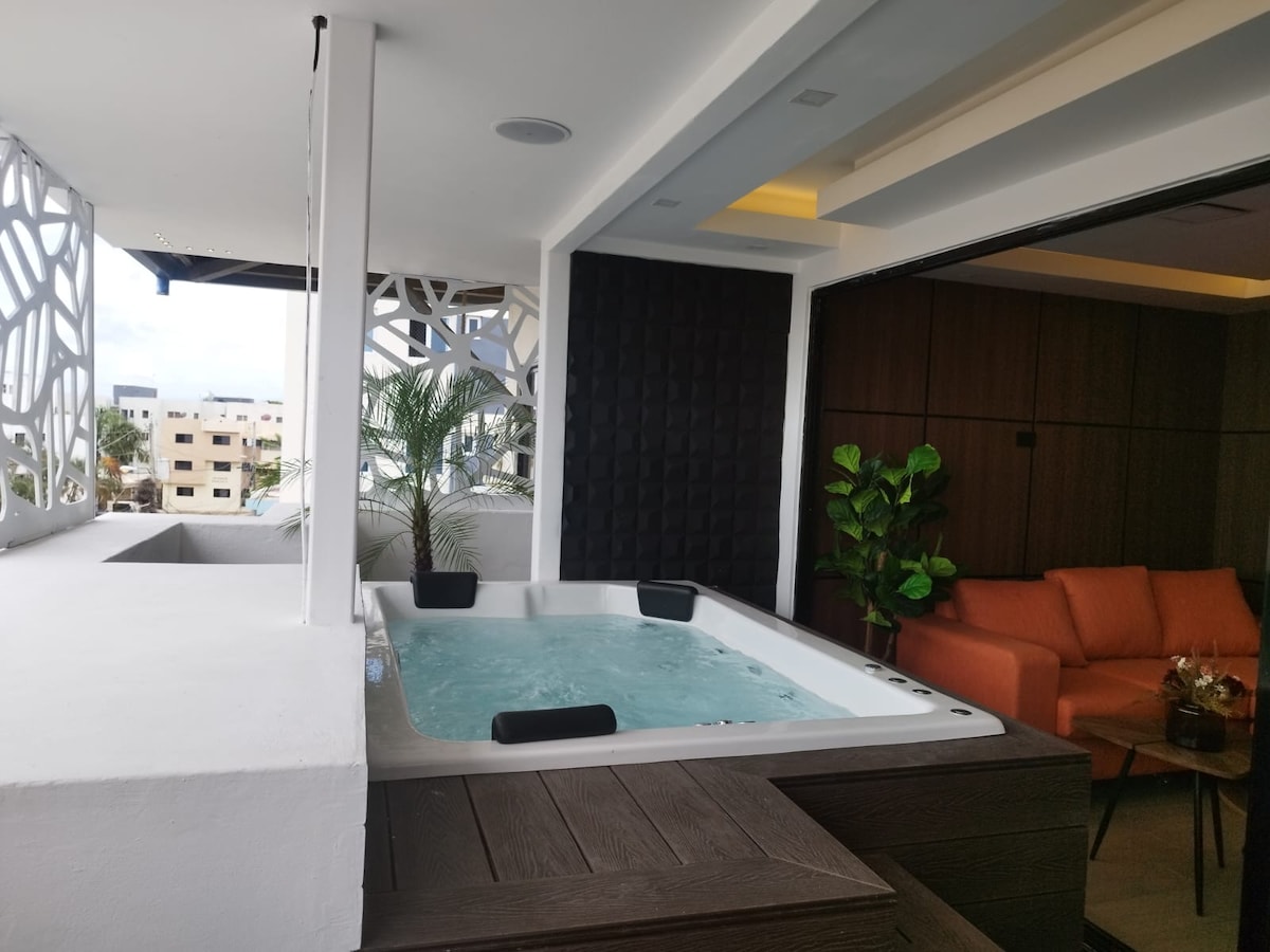 Apartment with private terrace and jacuzzi!Only for our guest. Located in Santiago. Close to Airport & Monument ! Gated Residential! 3 bedrooms, AC, wifi, heated water! Terrace has private Jacuzzi ,dominoes table and grill. Shared pool Located near center of Santiago! Apartamento con Terraza y Jacuzzi en Santiago . Cerca del aeropuerto y el Monumento! Terraza tiene jacuzzi privado solo para nuestros clientes. 3 recámaras, aire acondicionado, wifi, agua caliente! ¡Piscina compartida!