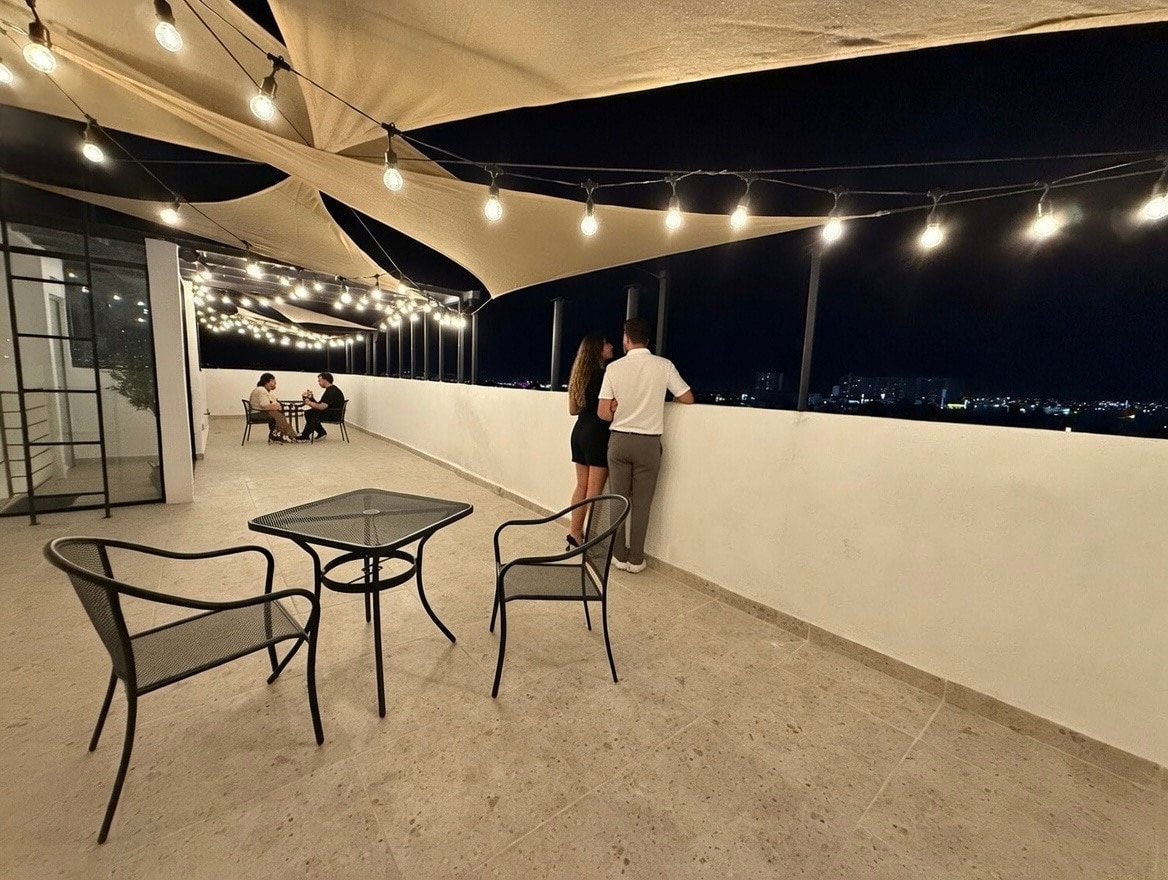 Hermoso Departamento con amplia terraza, limpio y muy acogedor. la construcción es nueva, así como los muebles que hay en su interior. el departamento es de concepto abierto, solo hay un biombo que separa el área del dormitorio con la sala, para dar un poco de privacidad. Hay un sofá cama, tamaño matrimonial, en la sala El departamento tiene amplias ventanas que brindan una excelente iluminación. y cuenta con una linda terraza, rodeada de plantas.