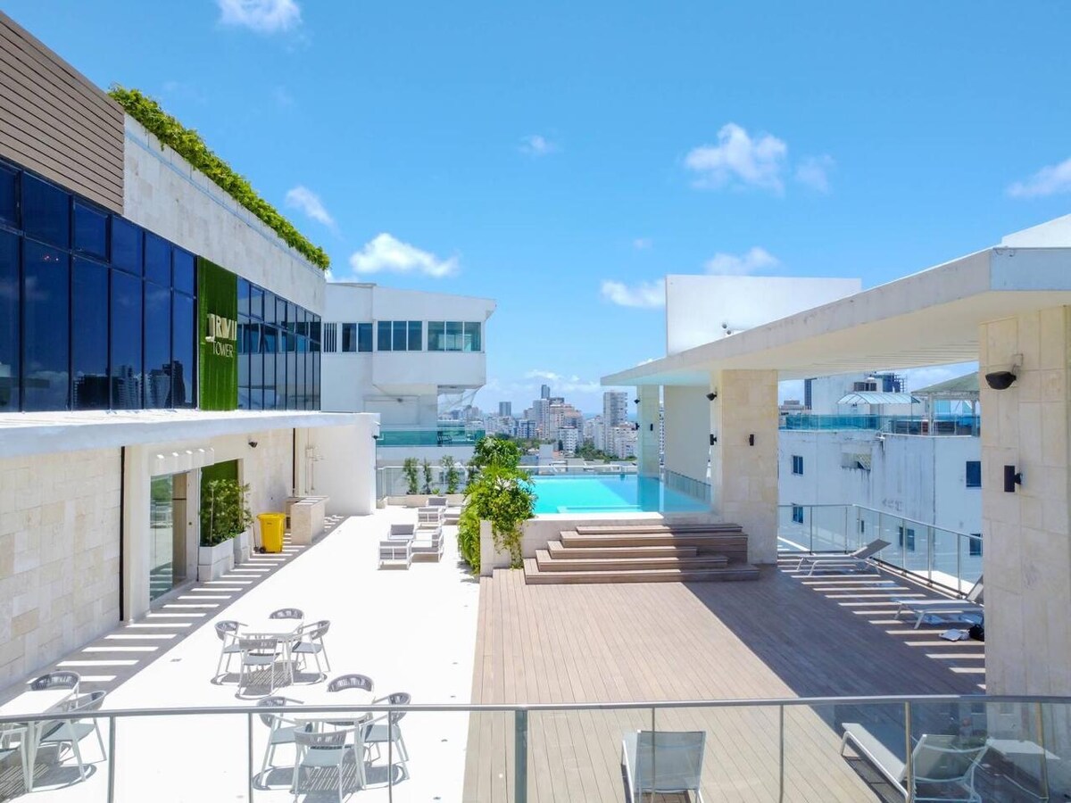 1 herbergja íbúð staðsett í JR7 Luxury Tower. Ef það sem þú ert að leita að er þægindi, öryggi og þægindi finnur þú það hér!! Fyrir frí, vinnu eða bara til að komast út úr daglegu lífi með maka þínum er þessi íbúð fullkomin!! Staðsett í hjarta Gran del Santo Domingo aðeins skrefum frá matvöruverslunum, veitingastöðum og verslunarmiðstöðvum!