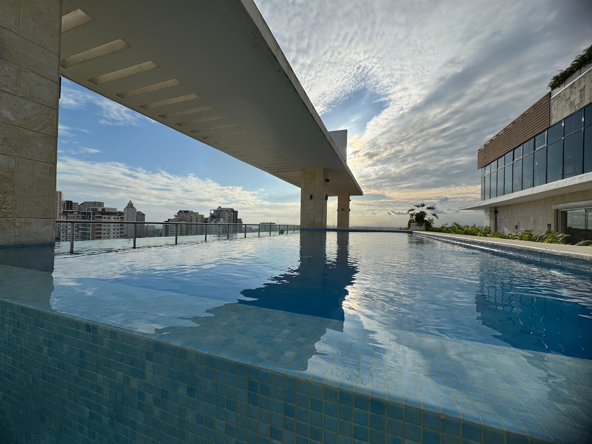 Lúxus íbúð, þægileg, nútímaleg og róleg, með öllu sem gestir þurfa fyrir skemmtilega dvöl. Tilbúið fyrir stutta og langa dvöl. Staðsett á 11. hæð í einum fullkomnasta lúxusturni borgarinnar Santo Domingo. Njóttu þæginda íbúðarinnar og framúrskarandi veitingastaða, verslunarmiðstöðva, matvöruverslana, afþreyingarmiðstöðva í nokkurra metra fjarlægð. Útsýni yfir hafið frá sundlaug og LÍKAMSRÆKTARSTÖÐ. Sveigjanleiki innritunar- og útritunartíma.