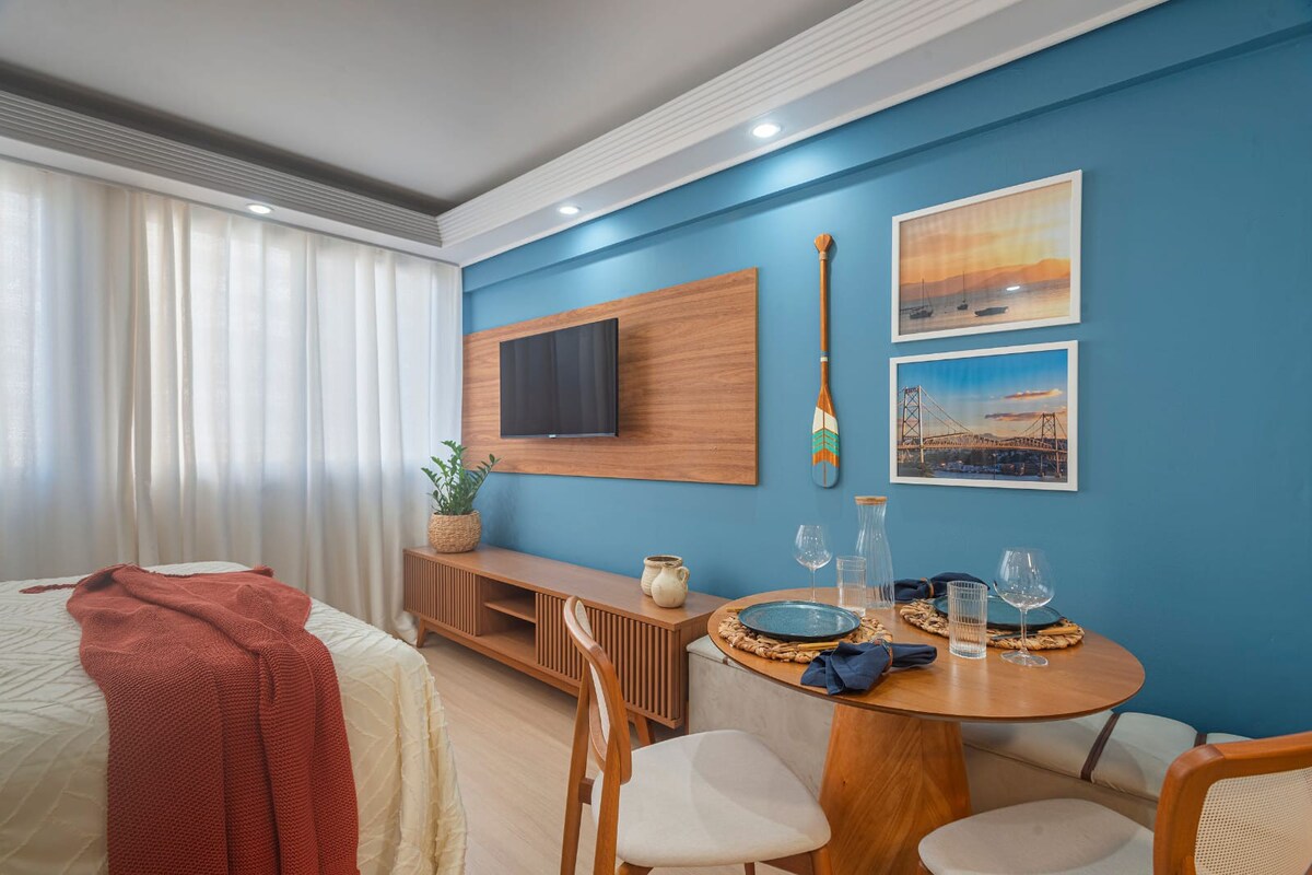 Glæný, tilvalið fyrir þá sem ferðast vegna vinnu eða tómstunda, frábær staðsetning, 300 metra frá Market og Main Avenue með nokkrum veitingastöðum, 10 mínútur frá miðbæ Floripa. Stúdíóið var allt hannað til að taka vel á móti einstaklingi eða pari. Þráðlaust net, sjónvarp, ísskápur, eldavél, örbylgjuofn, kaffivél, kaffivél, hraðsuðuketill og grunneldunaráhöld. Byggingin er einnig með sundlaug, líkamsræktarstöð, lyftur, gæludýrapláss, þvottahús og bílskúr.