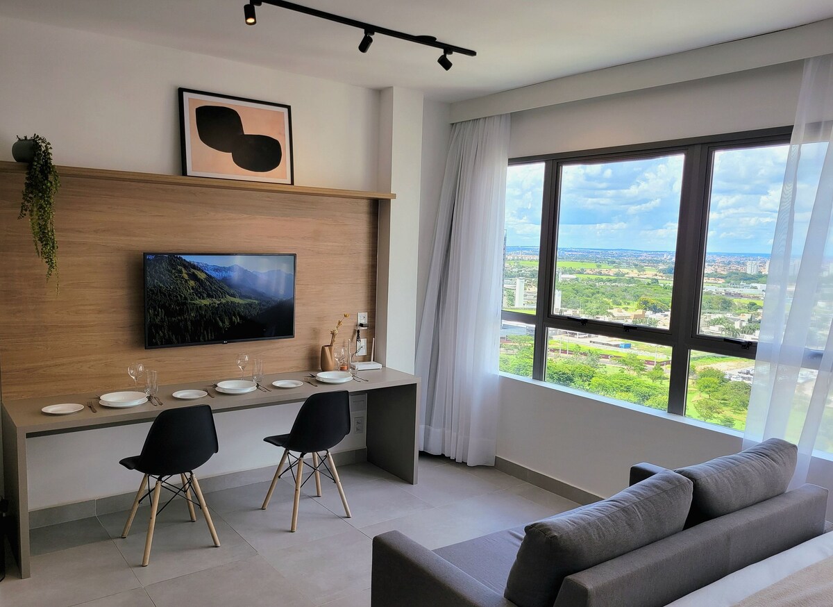 Stíllinn á eigninni er óviðjafnanlegur! Það er nútímalegt og mjög notalegt og býður upp á frábært útsýni yfir frægustu þak Rio Preto! Samþætt 33 m loftíbúð. Stofa með snjallsjónvarpi, 250 M Interneti, eldhúsi, baðherbergi með frábærri sturtu, notalegu tvíbreiðu rúmi og fullbúnu rúmi og baðlíni. Staðsett í vinsælustu byggingunni í S.J do Rio Preto, JK! Það er aðeins í nokkurra mínútna fjarlægð frá Basic Hospital, Famerp og Unip. Góður aðgangur að hraðbrautum, verslunarmiðstöðvum og matvöruverslunum. Ókeypis bílskúrspláss!
