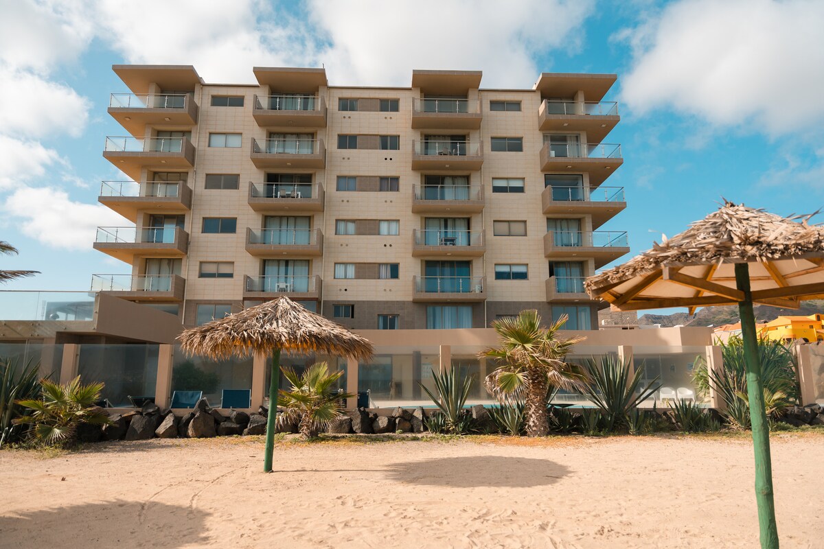 Frábær íbúð með sjávarútsýni og í göngufæri frá fallegu ströndinni í Laginha, 1,5 km frá miðbæ Mindelo! Þessi íbúð er með tvö konungleg svefnherbergi með sérbaðherbergi sem býður upp á fullkomið næði og þægindi. Íbúðin státar af töfrandi svölum sem bjóða upp á yfirgripsmikið útsýni yfir hafið, ströndina og fjöllin. Þú finnur fullbúið eldhús með öllu sem þú þarft til að útbúa dýrindis morgunverð eða máltíð, þráðlaust net, loftkælingu og flatskjásjónvarp.
