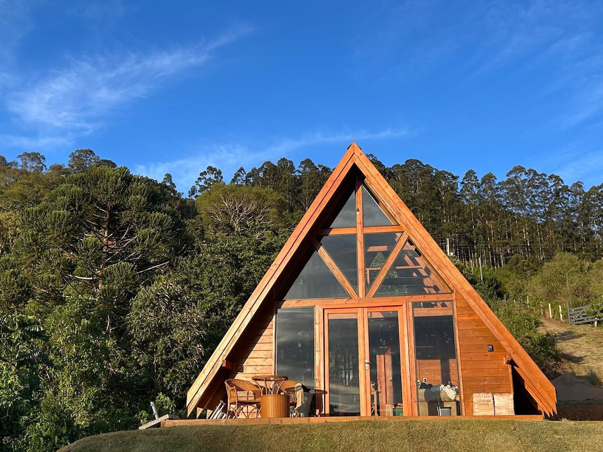 Upplifðu lúxus og ró í A-rammakofa okkar (mjög rúmum og vel byggðum) í Serra da Mantiqueira, 1200 m yfir sjávarmáli. Vaknaðu við kviknandi fugla og úðann frá fjöllunum. Njóttu stjörnubjarts himins í sjónaukanum og sjáðu ljósorma í loftinu að kvöldi til. Þessi 100 fermetra afdrep býður upp á queen-size rúm, Emma Original dýnu og hágæða hótelrúmföt. Slakaðu á við arineldinn og í nuddpottinum á baðherberginu eða njóttu sykurpúðarökelsu með fjölskyldunni. Lifi fjallið!
