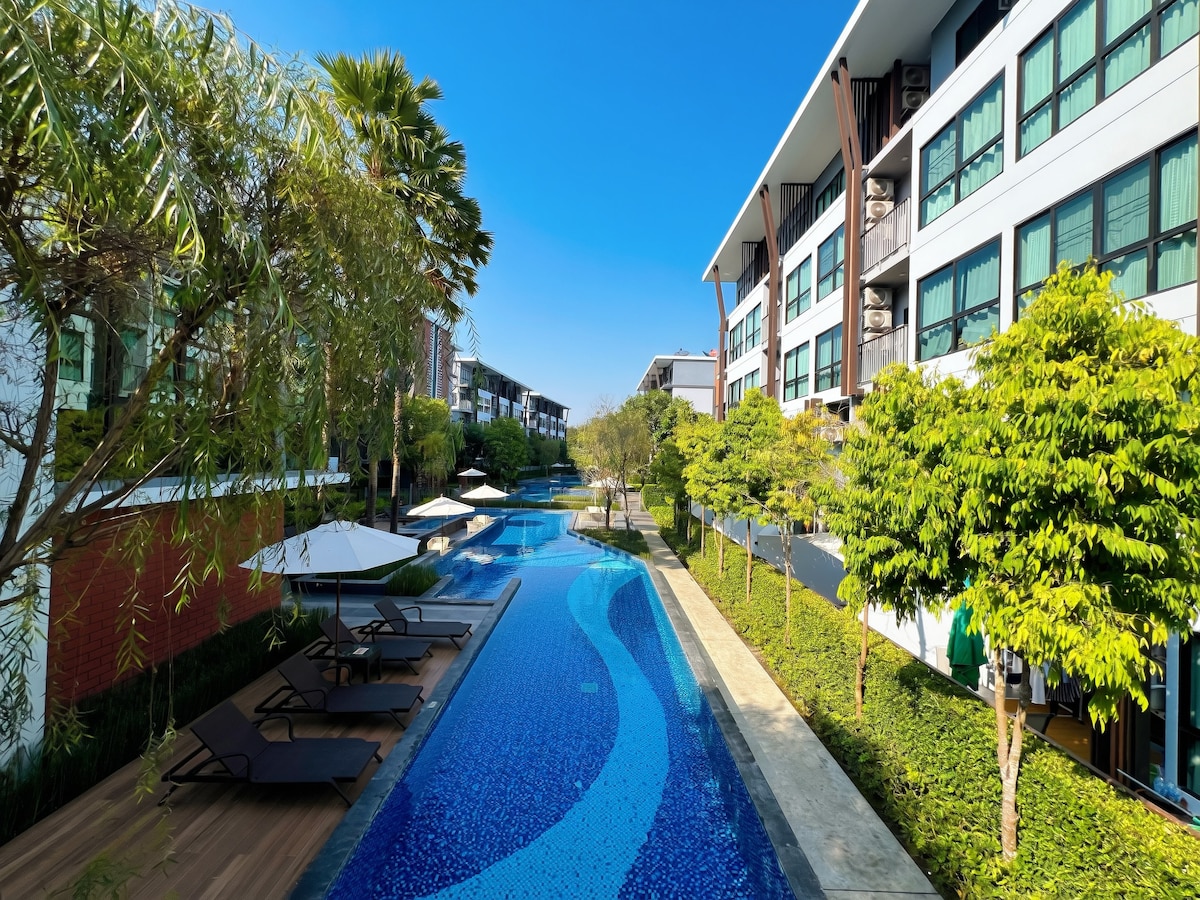 Nýuppgert hús er staðsett í borginni, í aðeins 5 mínútna fjarlægð frá flugvellinum og vinsælum ferðamannastöðum eins og Walking Street, Night Bazaar og Old City (Ku Muang). Það er rólegt og aðgengilegt innan öruggs samfélags sem veitir 24 klst öryggi. Húsið er í nokkurra skrefa fjarlægð (~20m) frá sundlaug þorpsins, gufubaðinu, líkamsræktarsalnum og græna garðinum. Húsið hentar vel fyrir fjölskyldur og vinahópa.