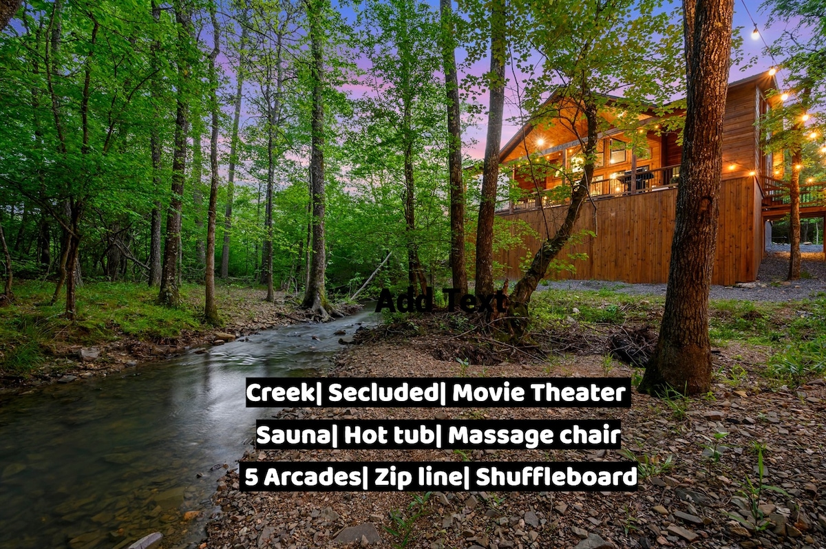 Our cabin offers the ultimate escape for those seeking privacy and tranquility. We also have amenities galore for different age groups. 🎬 Movie Theater 🎮 5 Arcade machines 🛁 Big Hot Tub + Barrel Sauna 💦 Seasonal Creek 💺 Massage chair 🛏️ 2 Kings + Bunk- Sleep 10 ⛳️ Zipline, Mini golf,Slide, Swings,Hammock 🥅 Foosball, Pool Table & Shuffleboard 🕹️ Corn hole +Arcades 🔥 Fire-Pit 🍳 Fully Equipped Kitchen