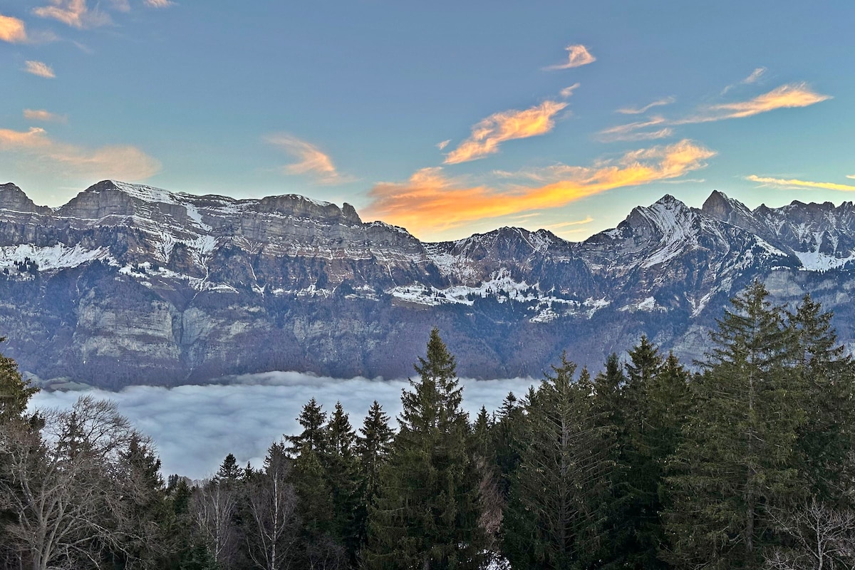 Notalega stúdíóið okkar er staðsett í Walenstadtberg í 850m beint fyrir neðan Churfirsten, sem gefur þér ákjósanlegan upphafspunkt fyrir gönguferðir, hjólaferðir osfrv. Kaldur hressing er í boði Lake Walensee, sem er 10 mínútur með bíl við rætur fjallsins. Þú getur endað daginn þægilega við eldskálina og notið töfrandi útsýnisins yfir dalinn. Rútuþjónusta er á staðnum Walenstadtberg.