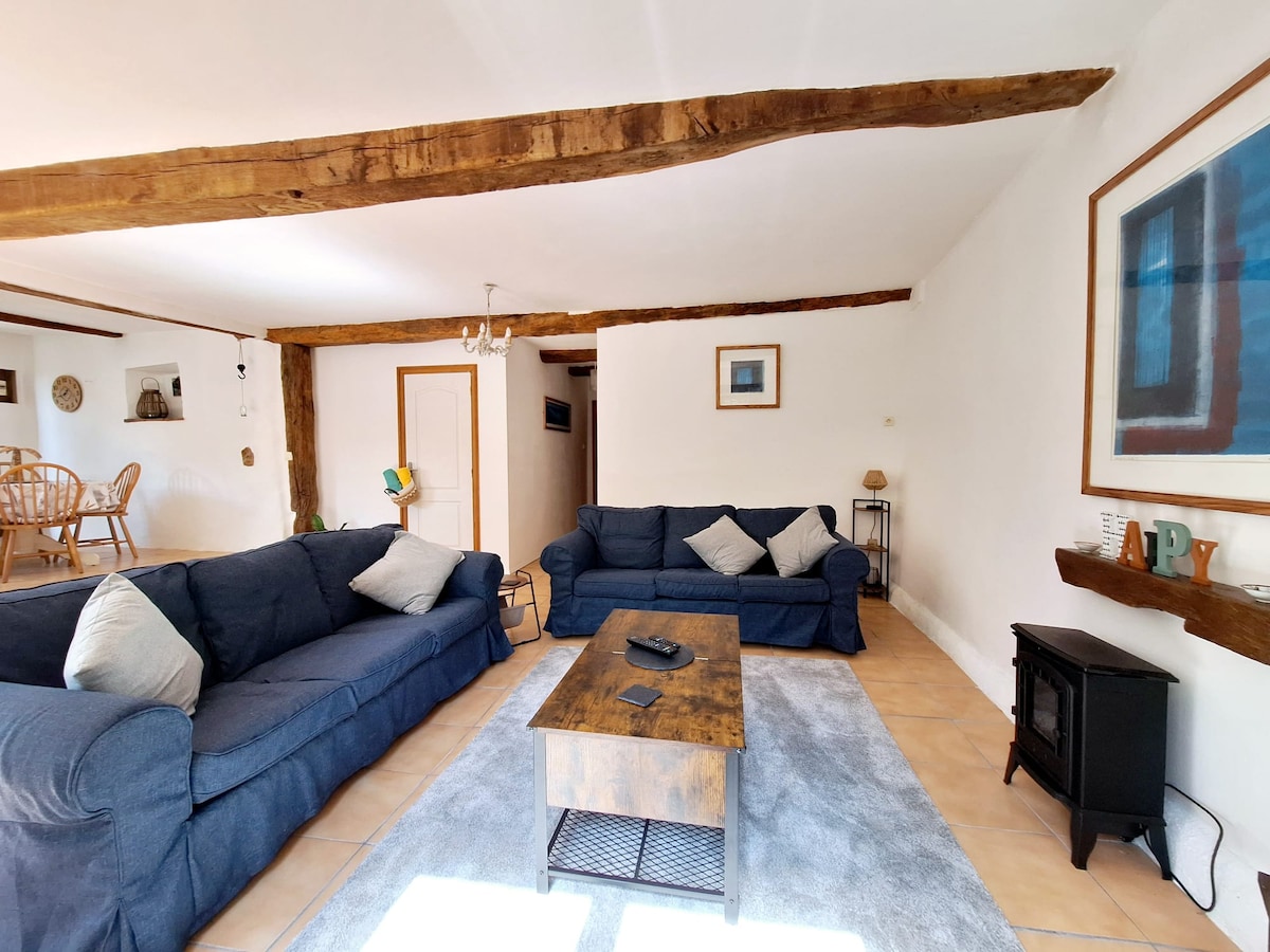 Nálægt Pyrenees í friðsælu þorpi, endurnýjað bóndabýli sem sameinar sjarma hins gamla og nútímalega. Hús sem liggur að sjálfstæðum hluta sem við búum við. stór stofa sem er 75 m² með fullbúnu eldhúsi og yfirbyggðri verönd með plancha. Á jarðhæð eru 3 svefnherbergi með fataherbergi og sjónvarpi í loftinu. Baðherbergi með ítalskri sturtu og balneo-baði. Þurrkari, þvottavél og ísskápur. Útiverönd með heitum potti!! Sundlaug með 2 sundlaugum!! FIBER HIGH DEBET