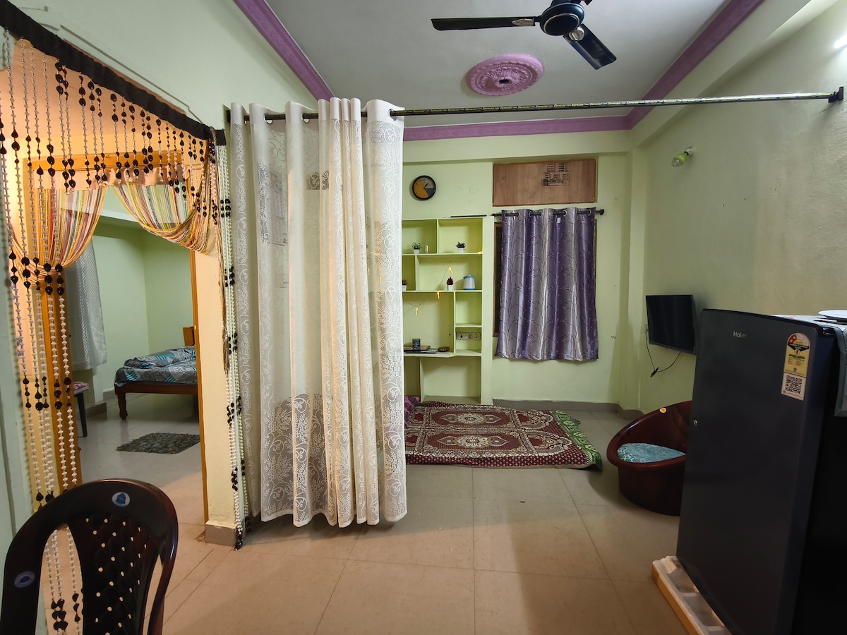✨ Modern 1BHK Retreat – Perfect for Couples & Solo Travelers ✨ Welcome to our thoughtfully designed 1BHK is ideal for travelers seeking comfort, style, and convenience. Hall with smart TV resting chairs and table for dining or work with internet. Kitchen with induction, utensils and water filter for perfect snacks or meal. Wash room has western tiolet and shower with hotwater. Prime area with easy access restaurants and local attractions. Rides and groceries delivery are minutes away.
