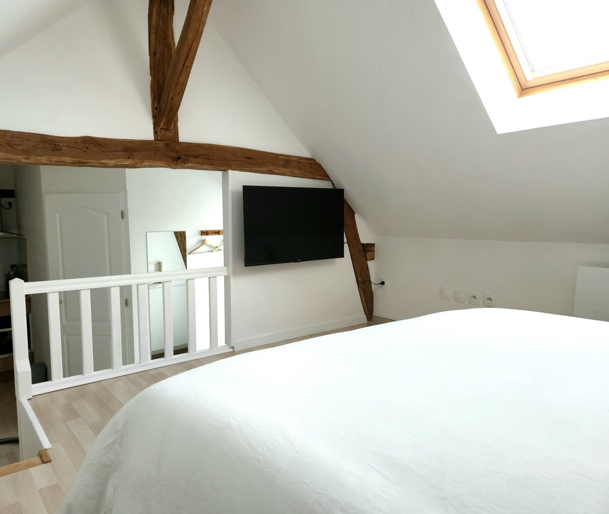 35m² bústaður staðsettur í útihúsi á morgunkornsbýlinu okkar. GISTINGIN er með LOFTRÆSTINGU, eldhús, stofu með BZ, svefnherbergi með hjónarúmi (140), millihæð með einu rúmi (90) og baðherbergi með ítalskri sturtu. Bílastæði án endurgjalds. Þægindi: - Kæliskápur - uppþvottavél - spanplata - Örbylgjuofn, - Senseo kaffivél - rafmagnsketill - brauðrist, - hárþurrka, - Sjónvarp