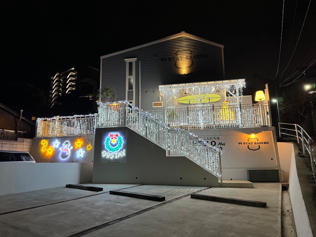 Nýbyggt í apríl★ 2021★ Sama verð fyrir allt að 5 manns Gisting fyrir allt að 13 manns þegar bókað er samtímis með systurhótelinu Oyado Michi Oyado Street er staðsett í 10 mínútna akstursfjarlægð frá Huis Ten Bosido Road og í 7 mínútna göngufjarlægð frá Hayaki-stöðinni við hliðina á Huis Ten Bosch-stöðinni og er staðsett meðfram fyrrum Hirado Kaido Kaido Road og takmarkast við einn hóp á dag sem getur leigt japanskt nútímalegt og lúxus nýbyggt hús. Við bjóðum einnig upp á Omura Bay skemmtisiglingar á einkasiglingu sem fer frá Huis Ten Bosch Marina og SUP reynsluferðir í þjóðgarðinum Kujukushima.(Valfrjáls gjöld eiga við.) Vinsamlegast finndu þig nálægt fallegu hafinu í Sasebo. Það er nóg af gómsætum kampaverslunum, sushi-verslunum, krám og ramen-verslunum þar sem þú getur raðað þér upp. Einnig er stór matvörubúð í 5 mínútna göngufjarlægð svo þú getur einnig keypt hráefni frá staðnum og slakað á í gistihúsinu. Þegar þú ert búin/n að ganga í Huis Ten Bosch skaltu borða gómsæti á staðnum, slaka á í baði gistihússins og njóta dvalarinnar í Sasebo. Það er eitt ókeypis einkabílastæði á gistihúsinu. Frá annarri einingu munum við leiðbeina þér að nærliggjandi mynt bílastæði.(1 mínútu gangur frá gistihúsinu)