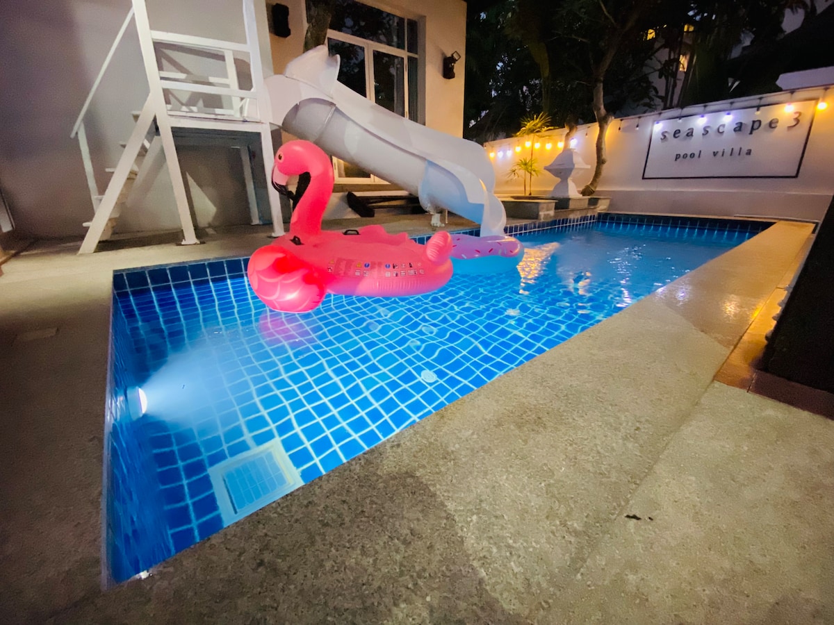 Slakaðu á með allri fjölskyldunni í þessari friðsælu sundlaugarvillu í 5 mínútna göngufjarlægð frá leynilegri strönd. Taktu fiskibát til að kynnast eyjunum í Sattahip með staðbundnum leiðsögumanni. Njóttu alls villunnar í næði með eigin sundlaug, kolagrilli utandyra, 65 tommu Samsung-snjallsjónvarpi, opnu eldhúsi í evrópskum stíl, breytanlegu pool- /borðfótbolta og öðrum leikjum sem eru tilbúnir fyrir þig. Innan friðsæls friðsæls húsnæðissamfélags í Na Jomtien, sem er þægilega staðsett á milli aðalvegarins og strandarinnar.