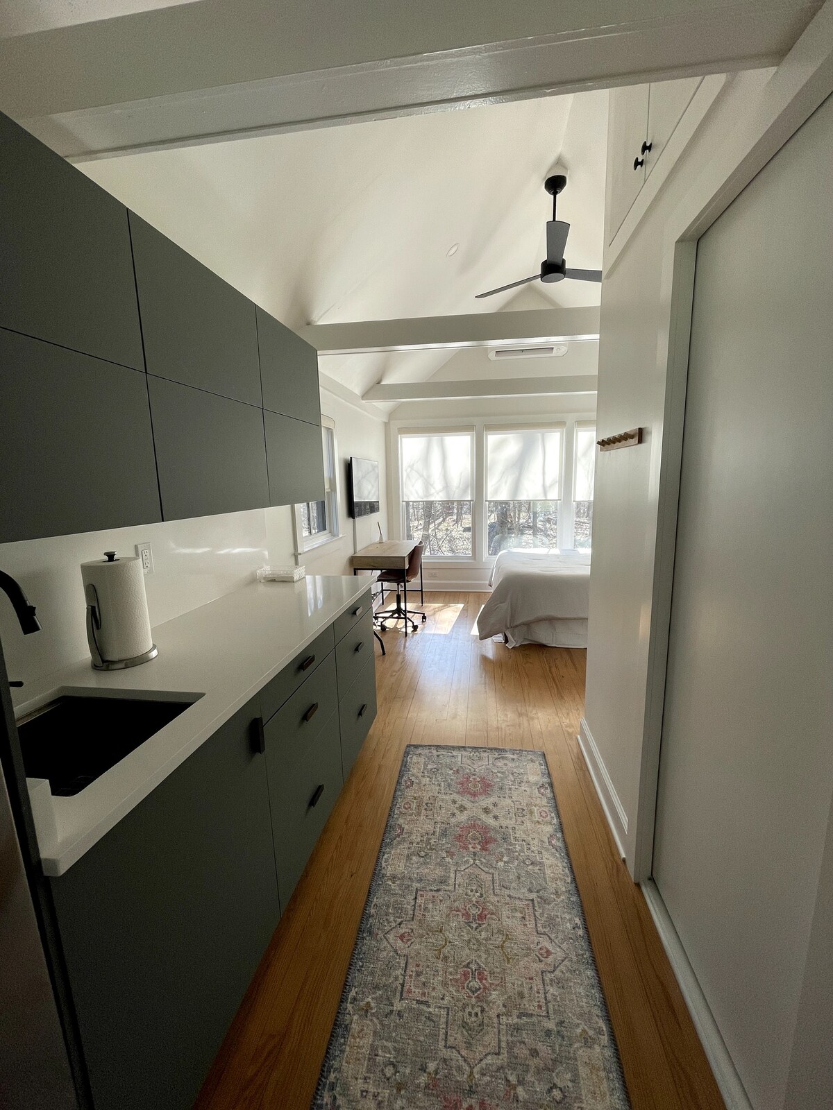 Nýinnréttað stúdíó á 2. hæð með sérinngangi. Eitt stórt svefnherbergi með queen-size rúmi, fullbúið bað með rúmgóðri sturtu, eldhúskrók og fataskáp. Mikið ljós og fallegt útsýni með útsýni yfir luscious landslag og rólegt Rouken Glen hverfið í kring. Stúdíó situr yfir bílskúr. Aðgangur að varatvottavél/þurrkara í kjallara okkar er einnig í boði. 4 mínútna akstur að Larchmont-stöð (35 mínútna lest til Grand Central).