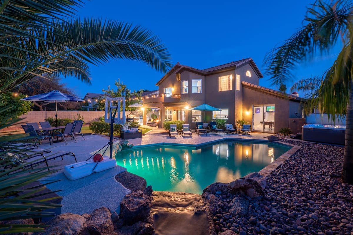 • 3400sqft house in private highly desirable Scottsdale neighborhood • Dual master bedrooms w ensuite baths, spacious living • Escape to an outdoor oasis featuring mountain views, cozy loungers, breathtaking sunrises, tranquil waterfall sounds • Serene 1acre lot, heated pool (option - read below), waterslide, huge lawn, built in BBQ, firepit, mountain backdrop • Wifi, cable TV, 1 70” LCD TV, 1 65" LCD TV, 1 55" LCD TV • Perfect blend indoor/outdoor living • AZ TPT: 21373618, Scottsdale 2025885