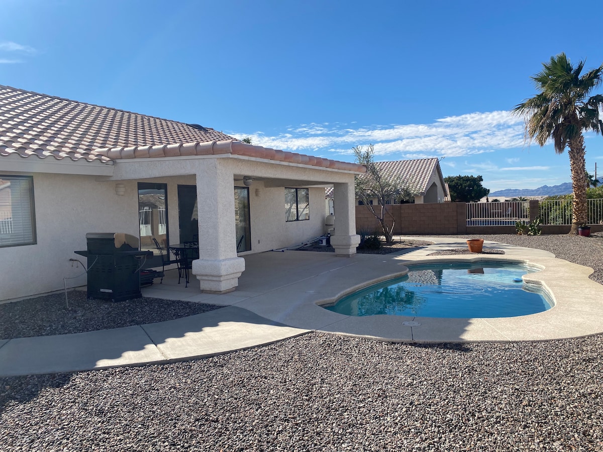 Relax with the whole family at this peaceful place to stay. Plan a memorable desert get away at our lovely 3 bedroom , 2 bath near the river home. Hidden away in a quiet/peaceful neighborhood with easy access to the Colorado River. After a fun filled day you can put together a home cooked meal with our fully equipped kitchen and bbq gas grill.