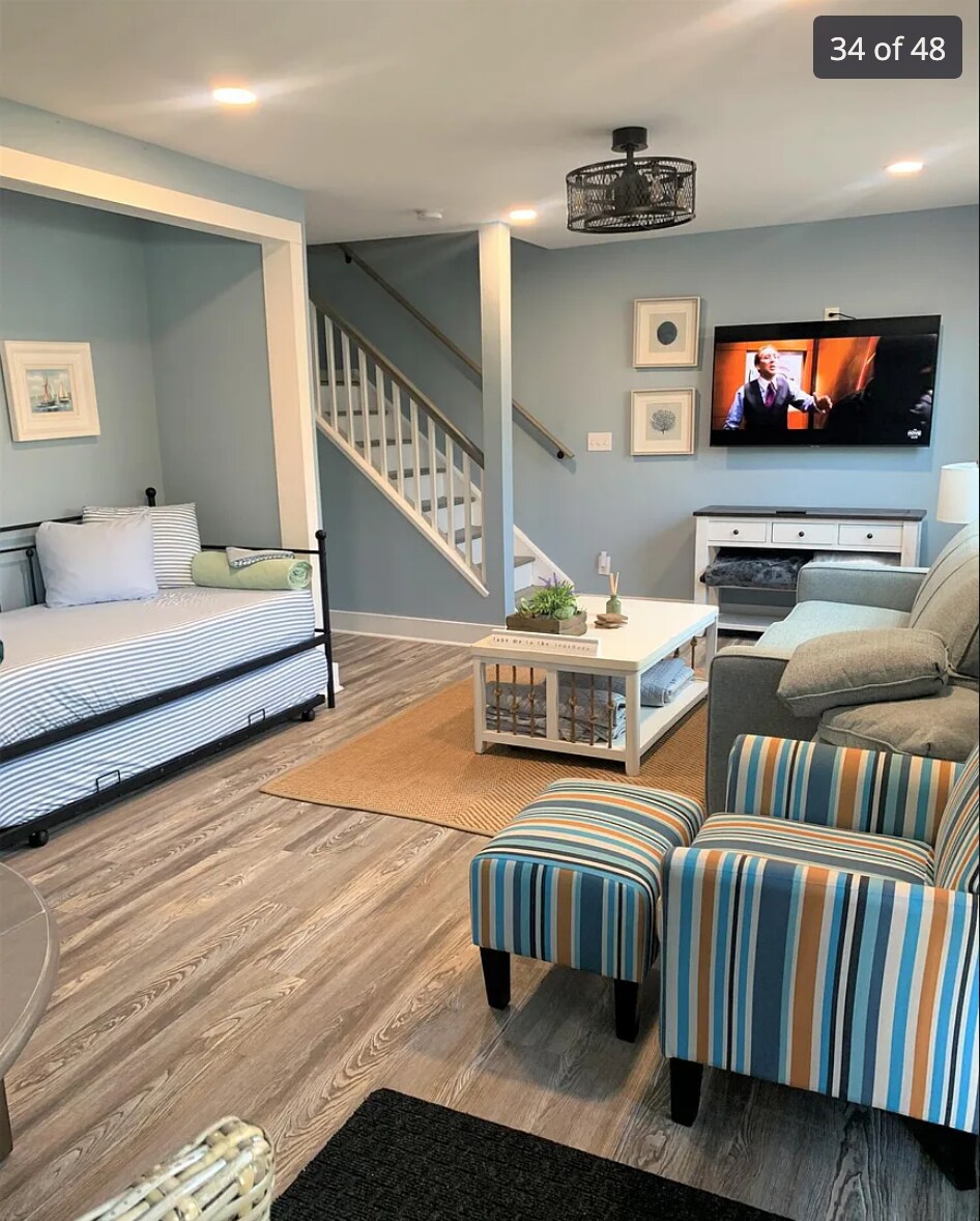 QUICK WALK UP THE BLOCK TO THE BEACH, Boardwalk & Restaurants. Endurgreiðslur vegna alvarlegs vetrarveðurs ÁREIÐANLEGT HÁHRAÐA INTERNET og skrifborð fyrir fjarvinnu. Einkahús, 3 hæðir, vel búið eldhús Fullkomin ferð frá stífluðum svæðum eða helgarheimsókn. Loftkælt, upphitað og ferskt sjávarloft. Bílastæði við eignina Skörp, hrein rúmföt, teppi og handklæði fylgja. Reiðhjól og strandstólar eru til staðar. Niðri með þvottavél/þurrkara/hálfu baði Kjallari fullkominn fyrir veiðarfæri