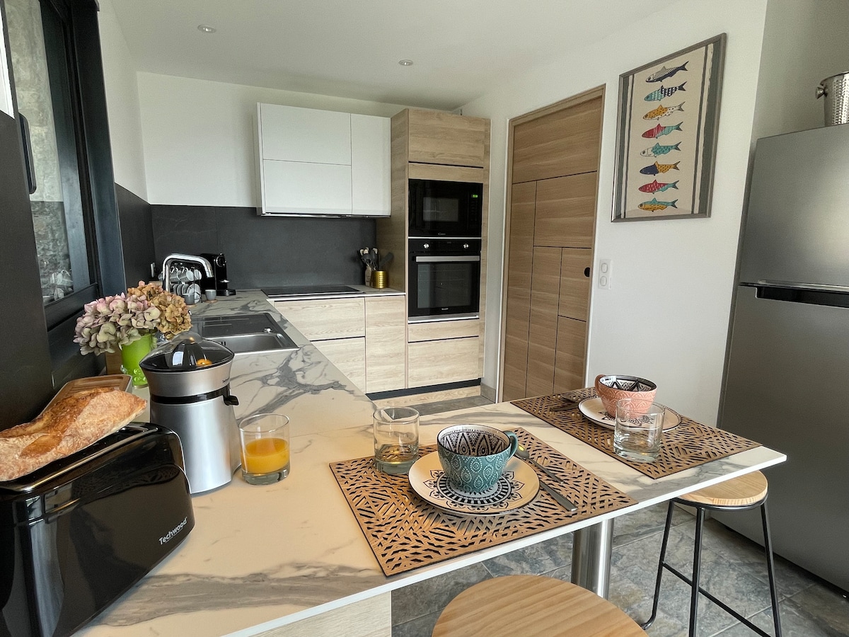 Þetta er 1. hæð í húsi fullt af sjarma og björtu og björtu sem skiptist í 2 íbúðir: efstu og neðstu. Einkaeignin þín er efst: - sjálfstæður inngangur, - 2 svefnherbergi, -1 stofa með arni, - 1 lítið baðherbergi, - 1 eldhús - 1 verönd með fallegu útsýni. Ég nýt með dóttur minni og kettinum okkar í neðsta hlutanum. Við munum deila garðinum (1600m2), sundlaug (á sumrin), trampólíni og rólum ef við erum á staðnum. Veröndin þín er einkarekin.
