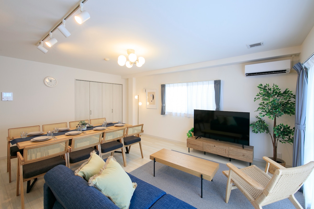 Þessi nýopnaða íbúð er aðeins ein bein lest frá Fukuoka-flugvelli eða Hakata-stöðinni og í um 15 mínútna akstursfjarlægð frá Tenjin. Þú færð alla 88㎡ hæðina út af fyrir þig sem rúmar allt að 9 manns. Eignin er fulluppgerð og mjög hrein með eldhúsi fyrir eldun og háhraða þráðlausu neti! Þægindaverslun er í 1 mínútu fjarlægð, matvöruverslun sem er opin allan sólarhringinn er í 10 mínútna göngufjarlægð og Fujisaki-stöðin er í 5 mínútna fjarlægð. Gjaldskyld bílastæði í nágrenninu henta vel fyrir bílaleigubíla.