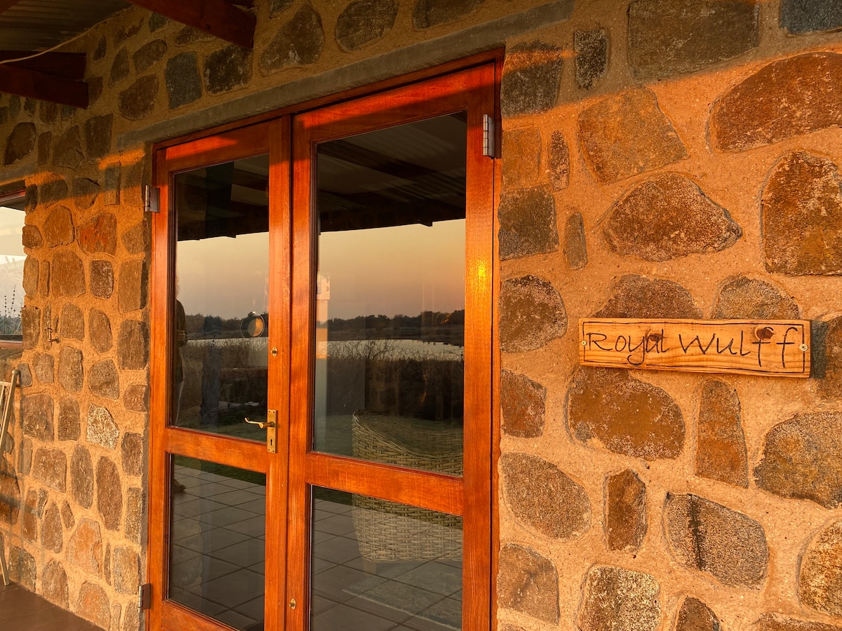 Royal Wulff is a cosy two-sleeper cottage, identical to our Marabou cottage, perfect for a fisherman’s adventure or a romantic getaway in the bush. Located near the two tranquil dams, the cottage boasts a studio layout that ensures intimacy and comfort. Royal Wulff’s king bed and tidy sitting area are warmed each evening by an indoor fireplace, while the patio opens right onto the African bush and the dam’s distinct ecosystem. This cottage is pet friendly.