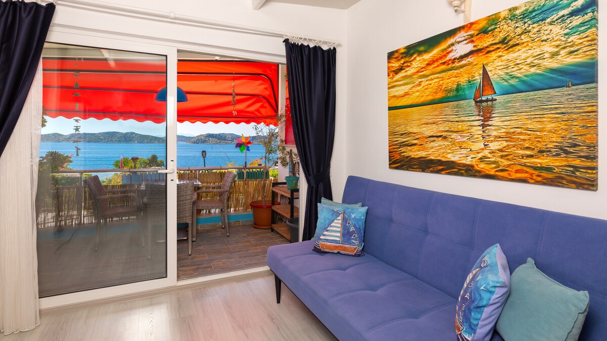 No2 íbúðin okkar er 1+1 og er á 1. hæð í tveggja hæða byggingunni okkar. Hver íbúð er með svölum og stórkostlegu sjávarútsýni. Það eru 2 loftræstingar í íbúðinni okkar, bæði í stofunni og svefnherberginu. Í eldhúsinu okkar eru alls konar áhöld þar sem þú getur útbúið matinn þinn. Við erum einnig með svæði í garðinum okkar þar sem þú getur lagt bílnum þínum.