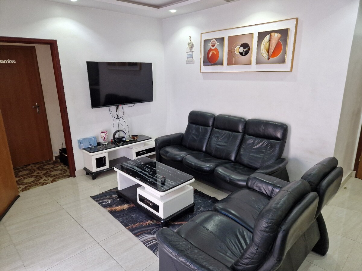 Komdu og kynnstu þessari íbúð með einstökum sjarma. Hér er stór stofa ásamt borðstofu með svölum með óhindruðu útsýni, 2 þægileg svefnherbergi fullbúin og loftkæld, hvert með sér baðherbergi og samliggjandi salerni, 1 eldhús með svölum og einkabílastæði. Þú ert staðsett/ur í hjarta Cotonou og býður upp á ýmsa þjónustu í nágrenninu eins og stórmarkaðinn, Dantokpa-markaðinn, marga veitingastaði og líkamsræktarstöðvar. Flugvöllurinn er í 15 mínútna fjarlægð.
