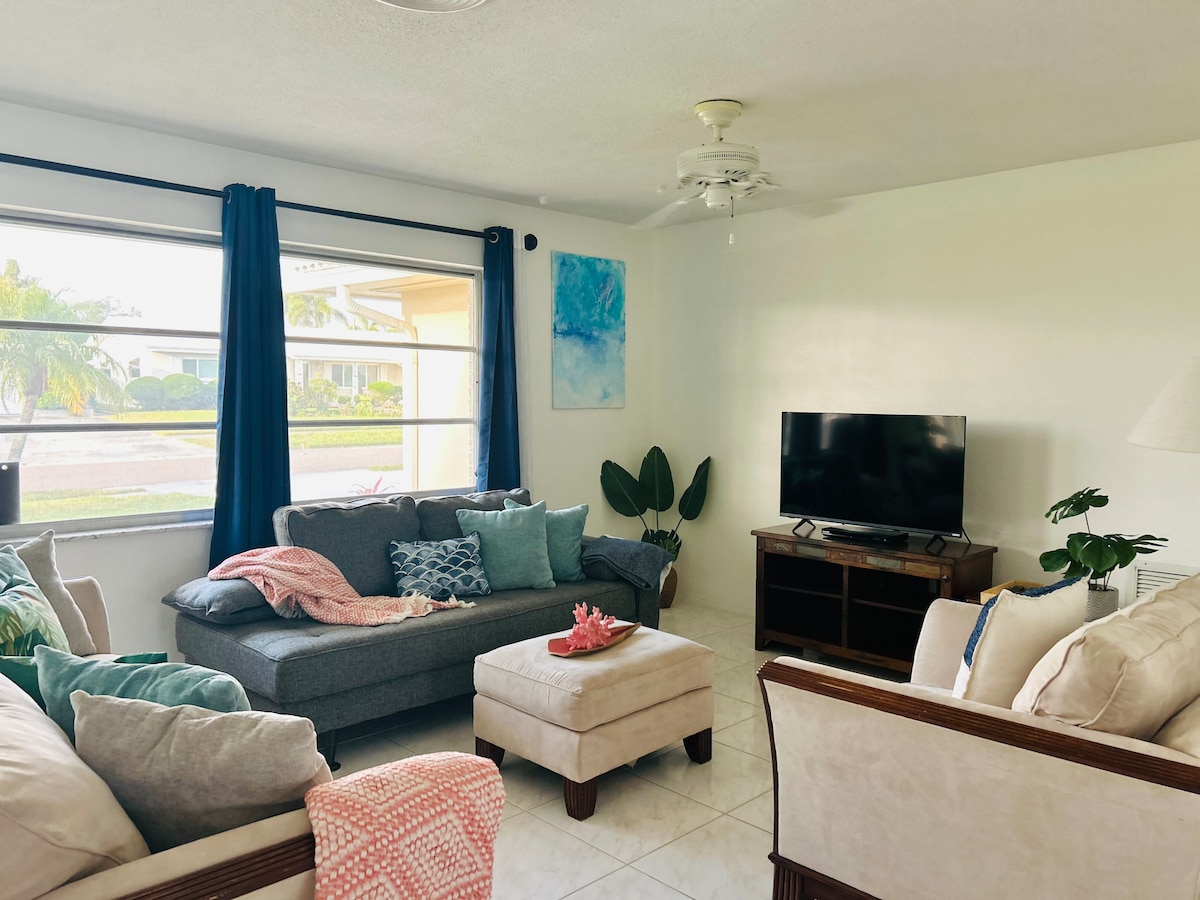 Upplifðu lúxus og þægindi á þessu fullbúna 3BR-heimili sem er í aðeins 10 mínútna göngufjarlægð frá ströndinni. Njóttu glænýrrar saltvatnsupphitaðrar laugar, opinnar hæðarskipulags og rúmgóðra veröndanna. Á heimilinu er nútímalegt eldhús, uppfærð baðherbergi, ný gólfefni og nýtt þak. Vertu með nóg af öllum nauðsynjum fyrir snurðulaust fjölskyldufrí, allt frá eldhúsáhöldum til strandbúnaðar. Slakaðu á í skimaðri setustofu og borðstofu utandyra til að fullkomna afdrepið. Hámark 6 gestir | Engin gæludýr leyfð