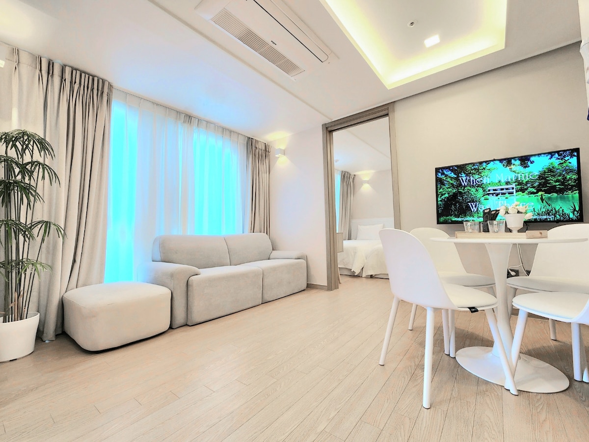Einstakt heimili við sjóinn að kvöldi til með gleri í aðalsvefnherberginu með nætursjó💜 Þessi rúmgóða eign hentar vel og er miðsvæðis fyrir marga til að gista í. Haeundae, Hongdae Hot★ Place ★ Gunam-ro Main Street, Staðsett við hliðina á Haeundae Traditional Market!!! Hreinlæti sem nýtt húsnæði opnaði árið✔️ 2023 Lúxus á Hotel Residences, the Gunam-ro gosbrunnurinn og hvísl hafsins Ég vona að þú verðir með ánægjulega minningu í minningum sem endast alla ævi. Allir staðir, matsölustaðir og dægrastytting í✔️ Haeundae eru í göngufæri. Haeundae Beach, Haeridan-gil, Sky Capsule, Beach Train, Dongbaek Island, o.fl. Ég vona að þú hafir það sem allra best hér🩷 Við höfum opnað síðan 2023, Þú getur notið endurnærða og hreinsaða andrúmsloftsins. Lokaður sjór gæti gefið eftirminnilegar stundir.
