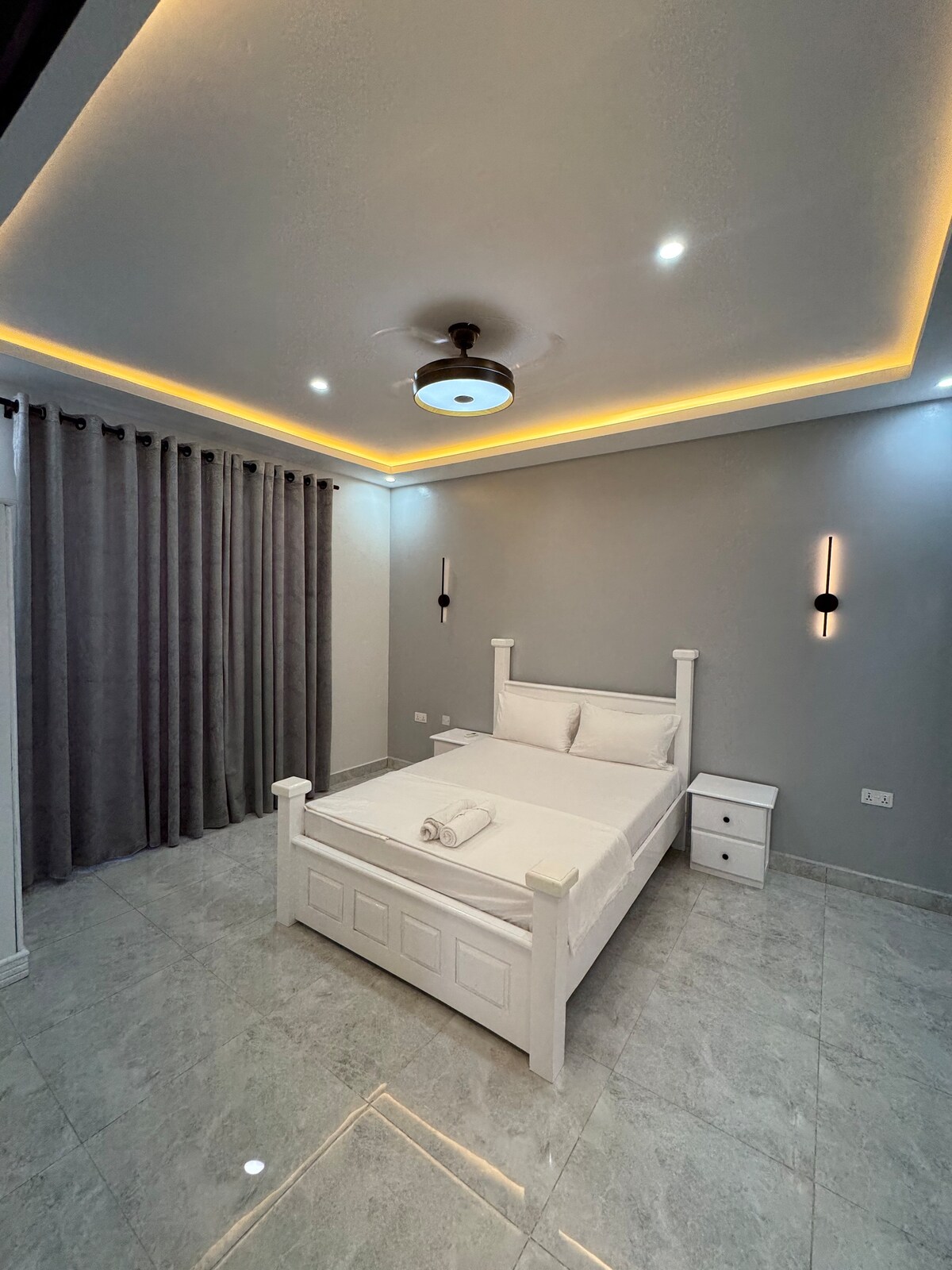 Íbúðin okkar er glæný og róleg með sérsundlaug, móttöku, staðsett í miðborg Kololi á einka-, öruggu og ferðamannalegu íbúðarsvæði Hún er með nýjustu tækjum sem tryggja heildarþægindi þín ( snjallsjónvarp,þráðlaust net, eldavél og þvottavél ect) Ráðstefnumiðstöðin er í 5 mínútna göngufjarlægð frá sjónvarpsstöðinni. Öll þægindi eru í nágrenninu og tengjast vel.
