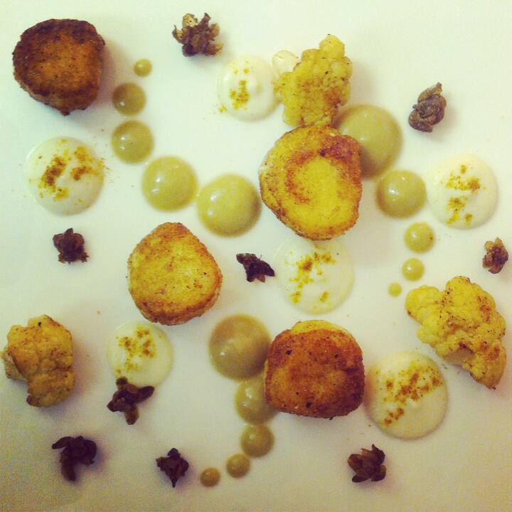 Steiktir hreistur, karrýblómkál og stökkt kapers.