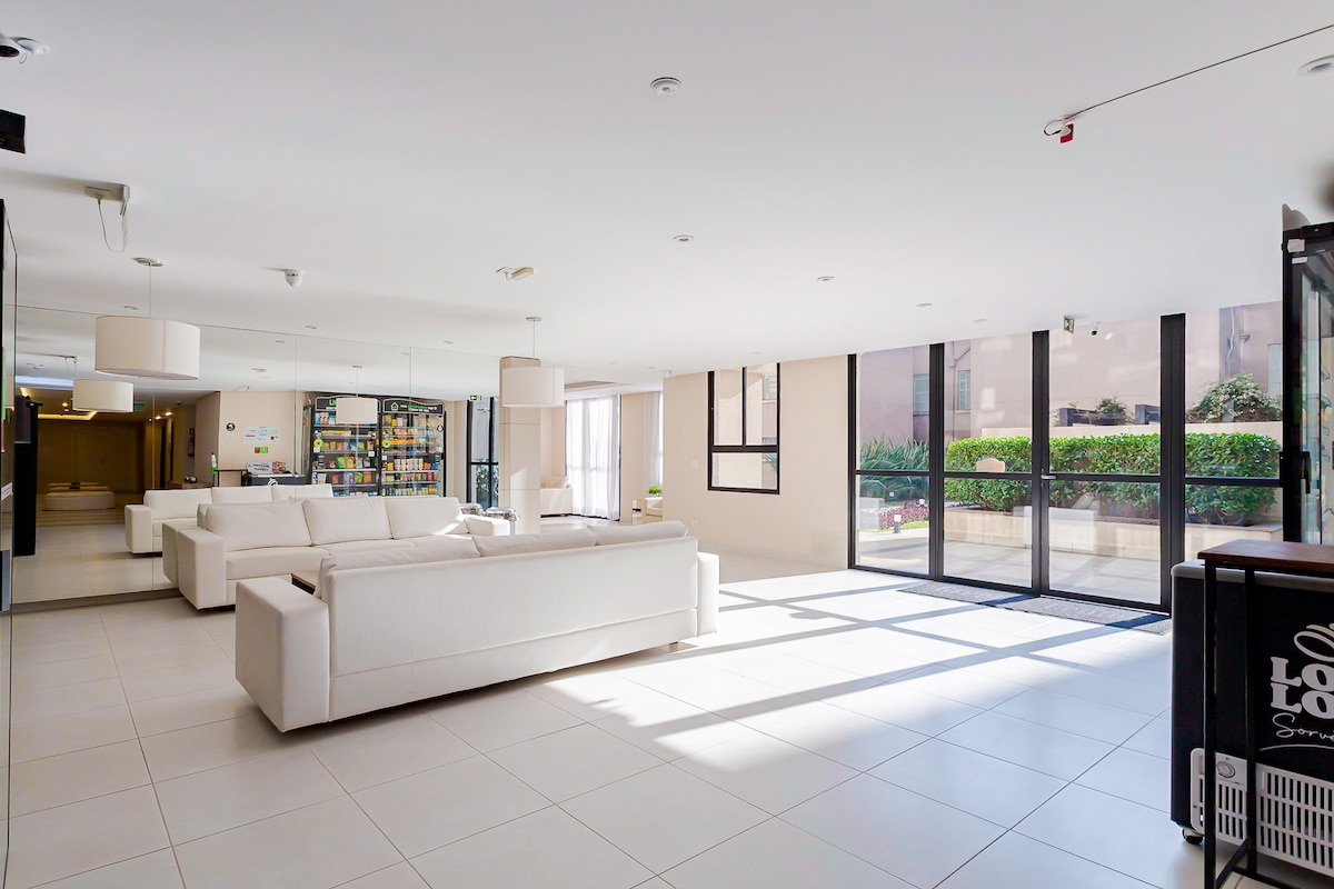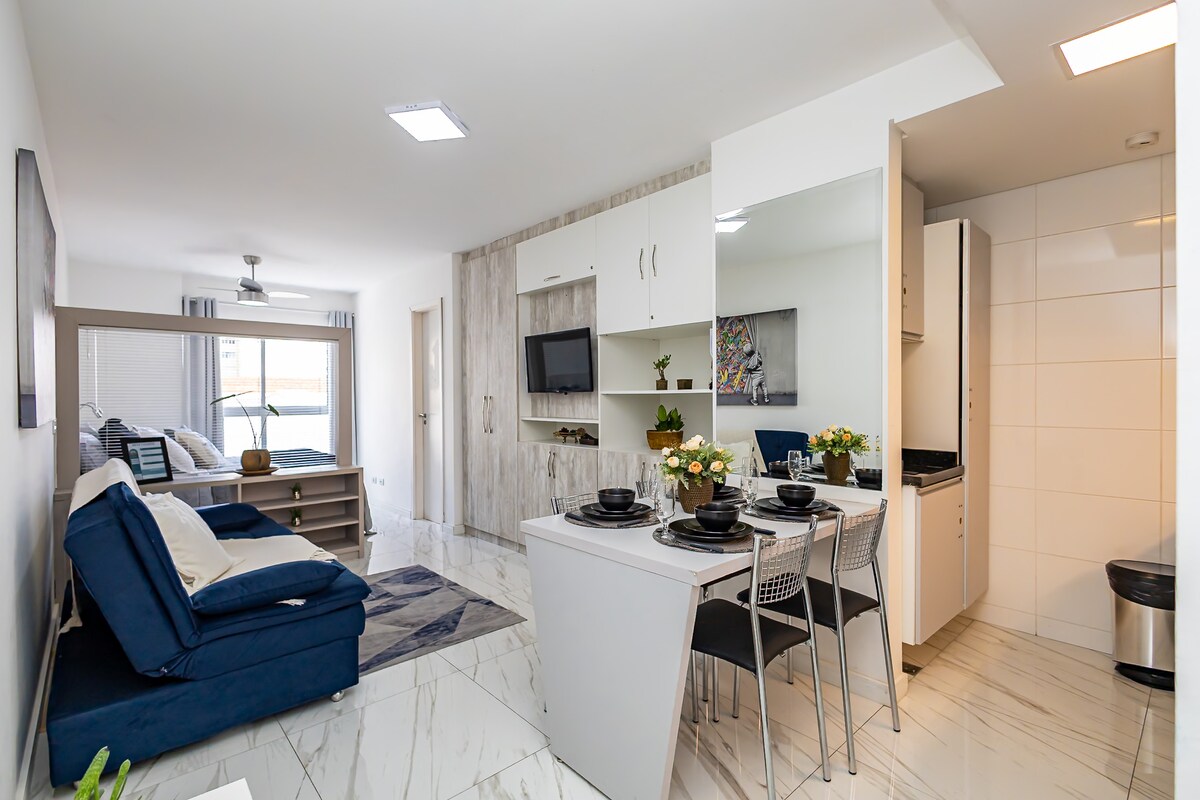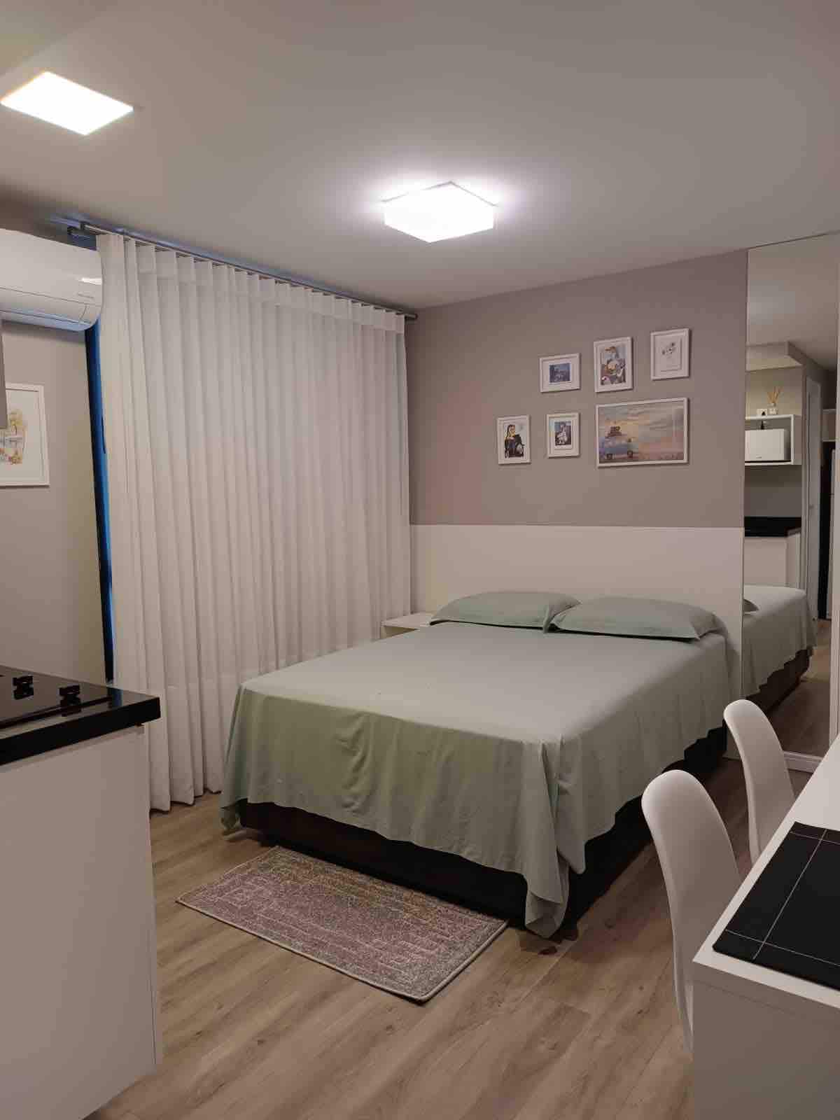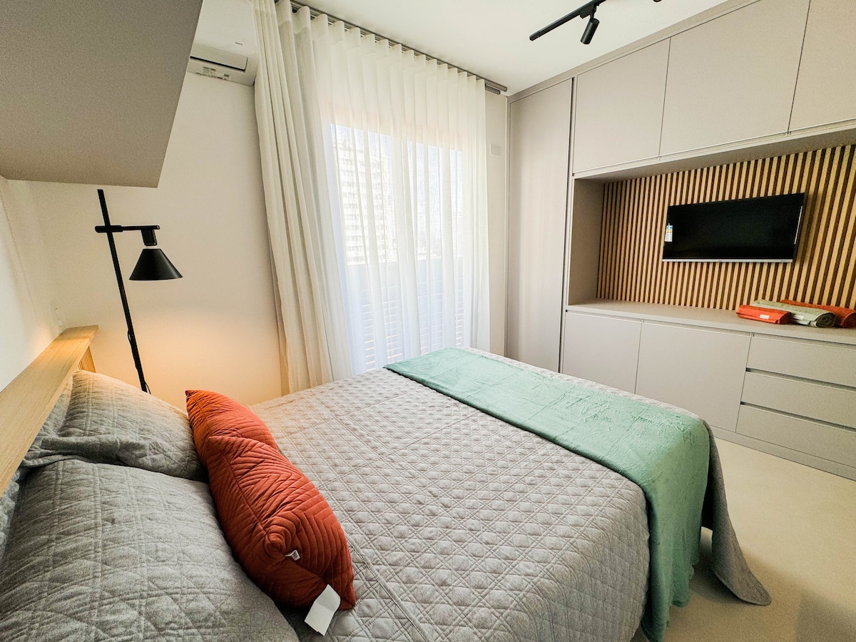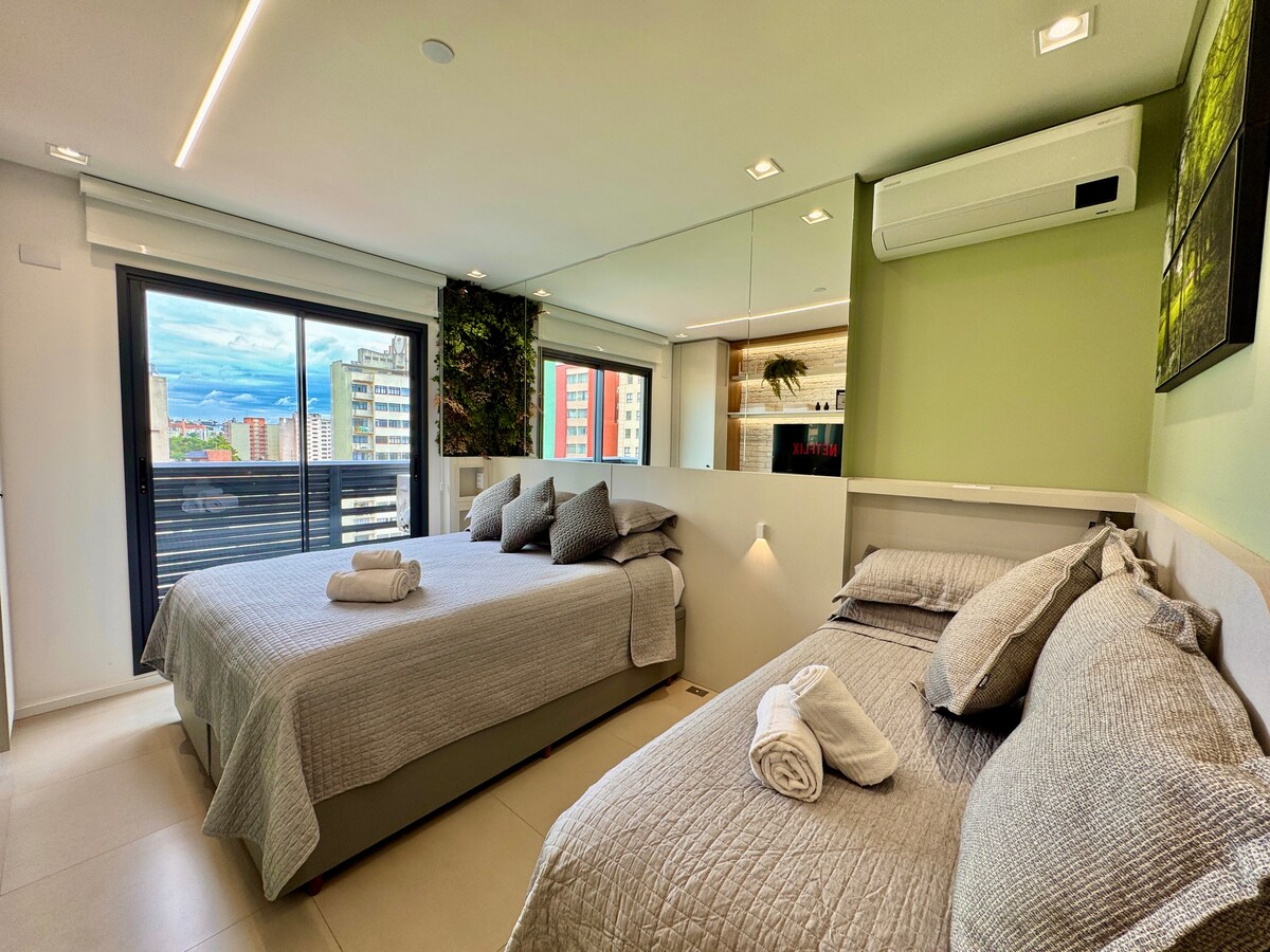 Gaman að fá þig í hágæðaafdrepið þitt í hjarta Curitiba! Þetta stúdíó er staðsett á einu af forréttinda svæðum miðborgarinnar og hefur verið vandlega hannað til að bjóða upp á þægindi, stíl og hagkvæmni. Umhverfið er fullbúið húsgögnum og býður upp á notalega upplifun sem hentar vel fyrir stutta og langa dvöl. Byggingin býður upp á fullkomna innviði sem á heima á hönnunarhóteli: þaksundlaug með yfirgripsmiklu útsýni, líkamsræktarstöð, setustofu undir berum himni til lestrar og afslöppunar.