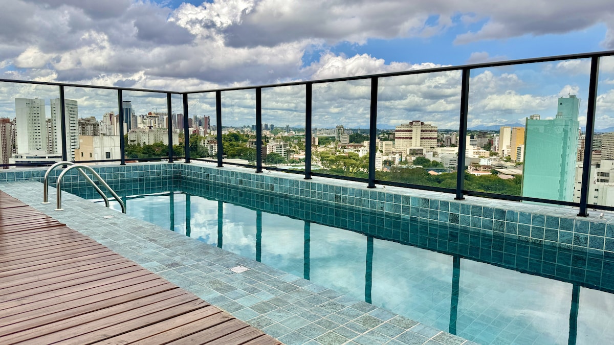 Njóttu bestu staðsetningarinnar í Curitiba! Þessi notalega og nútímalega íbúð er staðsett í hjarta borgarinnar, nálægt helstu ferðamannastöðum, veitingastöðum, verslunum og almenningssamgöngum. - ÞAKSUNDLAUG *Eiginleikar:* - 1 svefnherbergi með hjónarúmi - 1 einbreitt rúm innbyggt í hjónarúmið - 1 WC - LED sjónvarp - Eldhús með ísskáp, eldavél, örbylgjuofni og vatnshreinsi - þráðlaust net - Heitt og kalt loftræsting - Lyfta - Dyravörður allan sólarhringinn