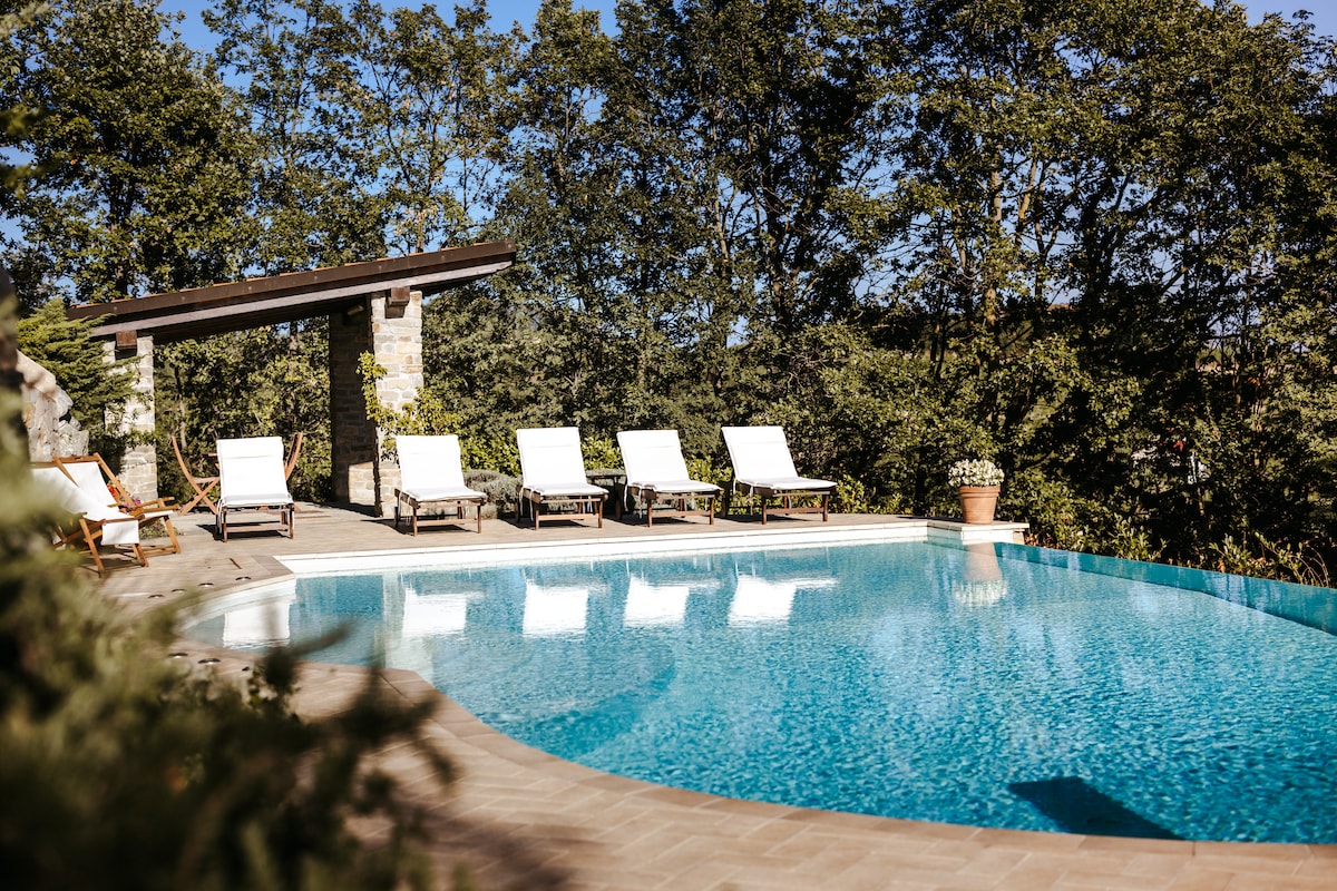 Meðal vínhæða, sem er á heimsminjaskrá Unesco, 2 hæða hönnunaríbúð breytt úr tignarlegri hlöðu, með HEILSULIND, 2 eldstæðum og 3 tvöföldum svefnherbergjum. Náttúrulaga útisundlaug með hidromassage fyrir hámarksþægindi.