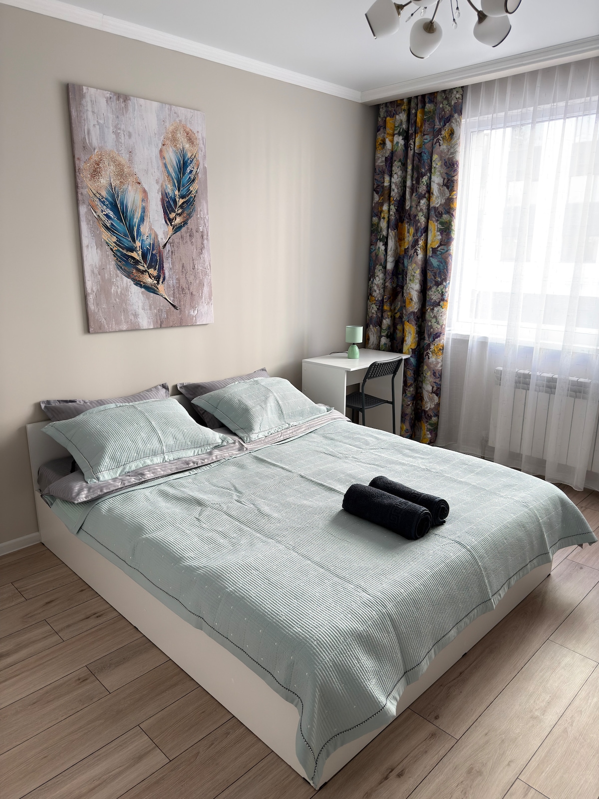 Verið velkomin í notalega og bjarta íbúðina okkar á rólegu svæði í Almaty. Glæný íbúðabyggð byggð árið 2022. Íbúðin okkar er með góðri sólríkri innréttingu sem fylgir nýjustu tækjum og húsgögnum. Við ábyrgjumst að eignin verði einstaklega hrein og vel við haldið. Við erum reglulega hrein og snyrtileg. Allar vörur og vörur eru í góðu ástandi og nú þegar til reiðu fyrir fyrirtæki. Það verður gaman að sjá þig í íbúðunum okkar!