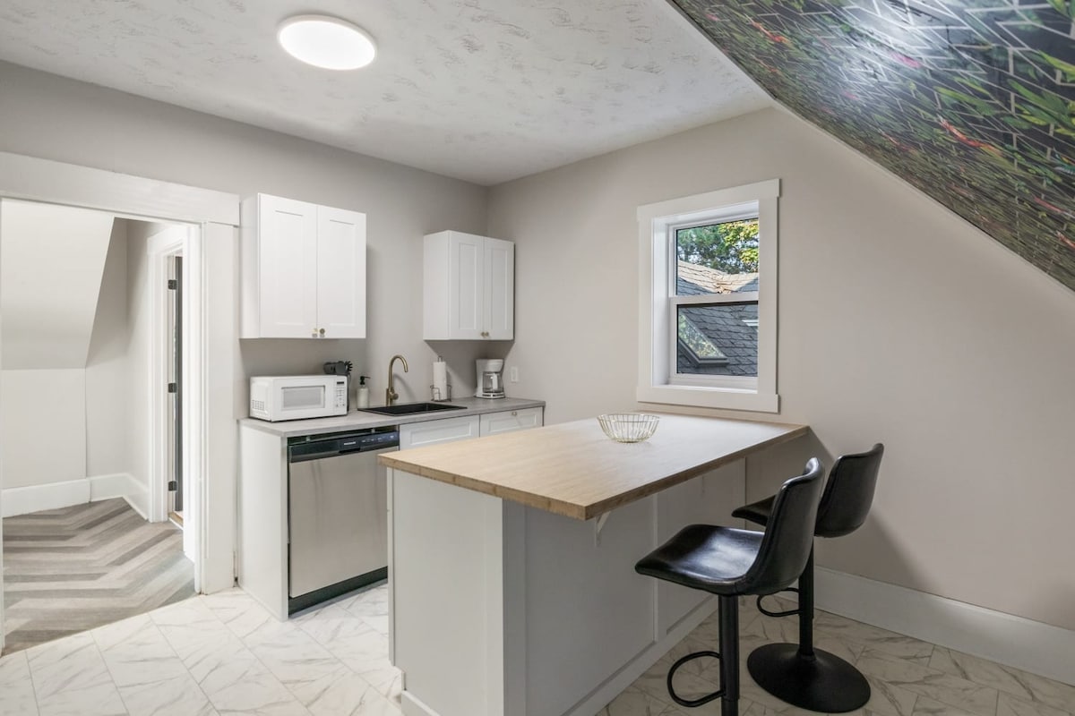 Victoria loftíbúð í heild sinni með eldhúsi.
