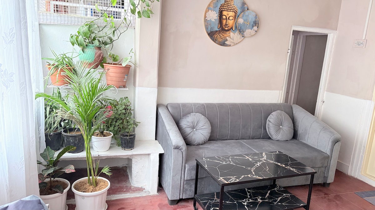 Þessi friðsæli og rólegi staður er listrænn og fágaður, með plöntum, höggmyndum, málverkum, forngripum og skapandi hönnuðum innréttingum. Hann er hannaður af listamanninum Tarpan Patel og er miðsvæðis, nálægt áhugaverðum stöðum, vinsælum veitingastöðum, börum, listum og menningarmiðstöðvum. Íbúðin er á 2. hæð án lyftu. Bílastæði eru fyrir utan svæðið við aðalveginn. Getur verið 1 eða 2 mín ganga. Gestir eru ekki leyfðir vegna Covid.