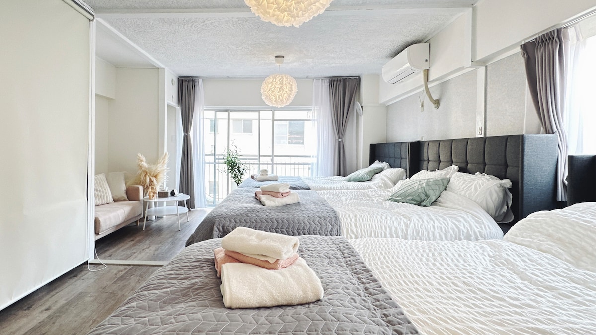 Það er þægilegt fyrir alla fjölskylduna að fara hvert sem er á þessum miðlæga stað. Tvö king-rúm í herberginu sem henta fjölskyldu og vinum Gólfið er þægilegt og rýmið er út af fyrir sig.Hentar allt að 5 manns. Í opna eldhúsinu er nóg af spaneldavél, pottum og diskum, langar að borða heimaeldaðar máltíðir, japönsk einföld eldamennska er ekki vandamál Barinn er tengdur við stofuna og borðstofuna, hvort sem það er morgunkaffi eða kvöldverður, allt er alveg rétt. Vaskurinn er hannaður með aðskildu baðherbergi svo að þú getir gist hjá nokkrum á eigin hraða Það er afslappaðasta stund ferðarinnar að bjóða upp á Bluetooth-hljómtæki, hlusta á tónlist og fara í heitt bað á kvöldin í Japan. Það er skjávarpi í herberginu svo að þú getur auðveldlega tengt almenna stafræna streymisverkvanginn Þvottavél, lofthreinsari, straujárn og rúmgóður skápur, þú þarft, við erum öll til reiðu Rýmið hentar einum einstaklingi til að vinna hljóðlega á barnum eða gista hjá vinum eða fjölskyldu í nokkra daga Vertu eins og heima hjá þér og láttu fara vel um þig.