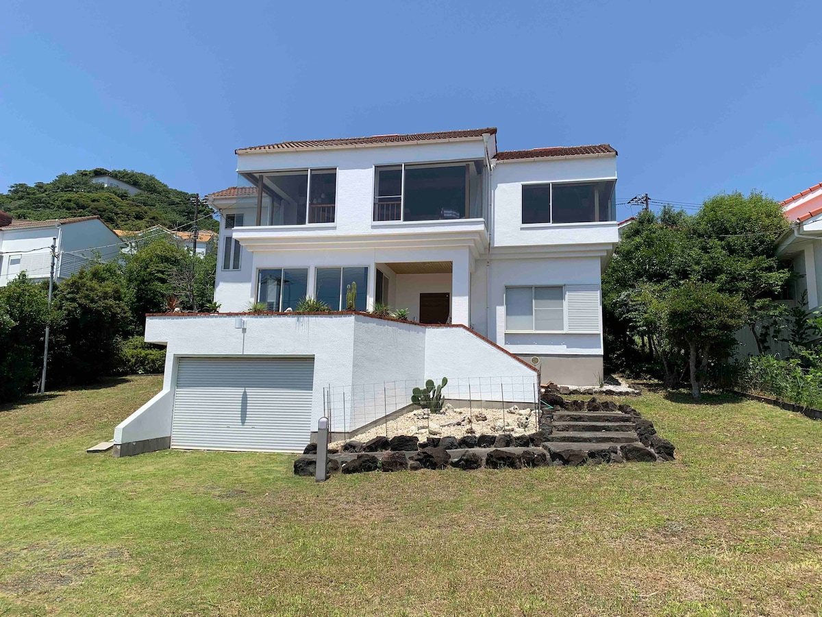 温泉と絶景テラス! 伊豆大島が一望できる白と青がイメージカラーの一棟貸し宿【グランブルー城ケ崎】