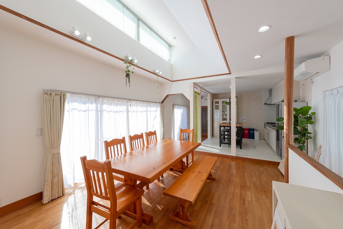道志村の山の中の絶好ロケーション。徒歩30秒で水の綺麗な川・公園・温泉へ。 一棟貸貸別荘には40㎡の土間があります。ご家族や友人での貸切での宿泊はもちろん、この家の特徴を生かし、イベントや集中合宿、期間限定の販売会等creativityが生まれる場所に。 新規事業を作りたい方・団体の方等で山籠りしたい方にこの土間は会議室として最適。展示やワークショップ等イベントの実施も可能です。 都内で机の上で頭を悩ませるより、山の中で美味しい空気と川のせせらぎに囲まれてきっと良いアイデアも。働く場所を思い切って変えてみることで違う景色が見え、ハンモックに揺られたり、徒歩すぐの公園や川遊び、森の中でリフレッシュ、温泉での気分転換も可能です。 また、Hygge Doshiは自分達でできる範囲で「環境負荷低減」にも取り組んでおります。使用電力は「再生可能エネルギー100%」を採用し、ごみを少なくするため、紙コップや割り箸、歯ブラシ等の使い捨てのアメニティはございません。 加えて、洗剤・シャンプー等も環境に配慮した製品を選定しております。宿泊時にエコなご利用にご理解・ご協力をよろしくお願いします。