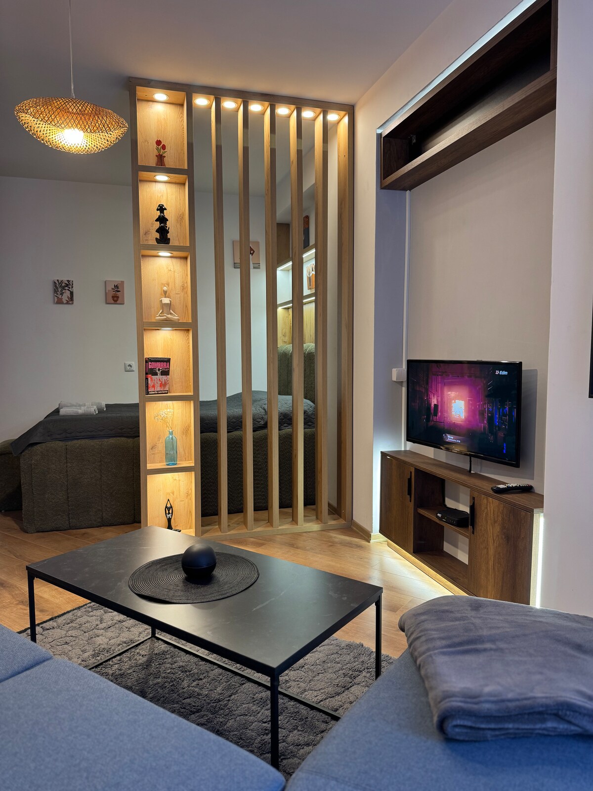Welcome to this modern, cozy apartment perfect for your stay in Prishtina. Featuring a fully equipped kitchen, a stylish living room with a smart TV, and a comfortable bedroom with a plush bed, this space offers everything you need for relaxation. Enjoy high-speed Wi-Fi, air conditioning, and a private balcony for fresh air. Conveniently located near local attractions and restaurants, this apartment is ideal for both short getaways and longer stays. Book your stay today!