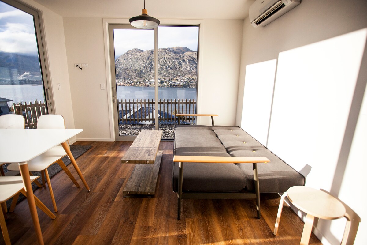 Notaleg 2 herbergja íbúð með stórkostlegu útsýni yfir vatnið og Remarkables. Milli Frankton og Queenstown; 5 mín. í búðir, 10 mín. í bæinn. Verönd með útsýni yfir vatnið og grill. Fullbúið eldhús með uppþvottavél. Ókeypis þráðlaust net, bílastæði, loftræsting og upphitaður handklæðaslá tryggja þægindi allt árið um kring. Svefnpláss fyrir 4 (úrval af rúmfötum) + svefnsófi fyrir 5. gest; barnarúm og barnastóll að beiðni. Tandurhreint og notalegt—fullkomið eftir ævintýra- eða skíðadag. Hjónarúm er hægt að breyta í tvö einbreið rúm með 48 klst. fyrirvara; rúmföt fyrir svefnsófa eru í boði.