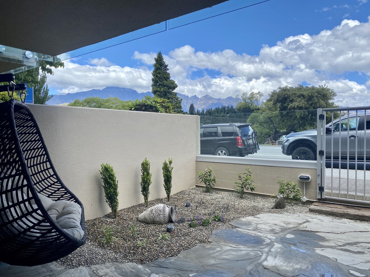 Lúxus 3ja herbergja 2ja baðherbergja íbúð í miðborg Queenstown með mögnuðu útsýni yfir stöðuvatn og fjöll. Njóttu opinnar stofu með gluggum sem ná frá gólfi til lofts, arni innandyra og fullbúnu eldhúsi. Rúmar fjölskyldur eða hópa með tveimur king-svefnherbergjum og barnaherbergi með stökum. Inniheldur ókeypis bílastæði í bílageymslu, þráðlaust net, þvottahús og sérinngang. Gakktu í bæinn til að borða og skemmta þér. Fullkomið fyrir næsta frí þitt í Queenstown!