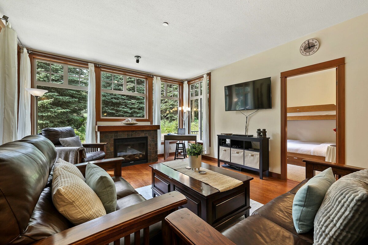 3 svefnherbergi, 2 baðherbergi eining sefur 9. Stofa, borðstofa, eldhús og svefnherbergi eru öll á sama stigi með miklu geymsluplássi og skápaplássi. Einingin er með þvottahúsi, 58" sjónvarpi, þráðlausu neti, borðspilum og einka heitum potti á stórri verönd með ótrúlegu útsýni. Bílastæði fyrir tvö ökutæki – eitt í upphitaðri bílskúr með rafhleðslutæki og eitt í innkeyrslunni. Í samstæðunni eru fleiri bílastæði fyrir gesti. Upphitaða bílskúrinn er einnig með skíða-/brettageymslu og stígvéla-/hanskahitara.