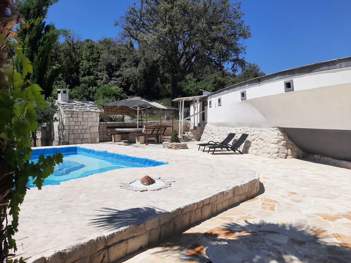 Villa er tilvalin fyrir twVilo-fjölskyldur með börn, það er aðskilinn inngangur fyrir tvö stór svefnherbergi,í hverju stóru herbergi er einn smal, tvö barnarúm, tvö baðherbergi með sturtu , eldhús með öllum tækjum .. stór garður með sundlaug ( upphitaður með sólhlíf),grill, borðtennis og trampólín ,fyrir utan eldhús... Það er staðsett nálægt frægu þjóðgörðunum Paklenica, ánni Krka, Kornati og Plitvice... VINSAMLEGAST skildu eftir minnst 7 daga milli daga þegar þú bókar