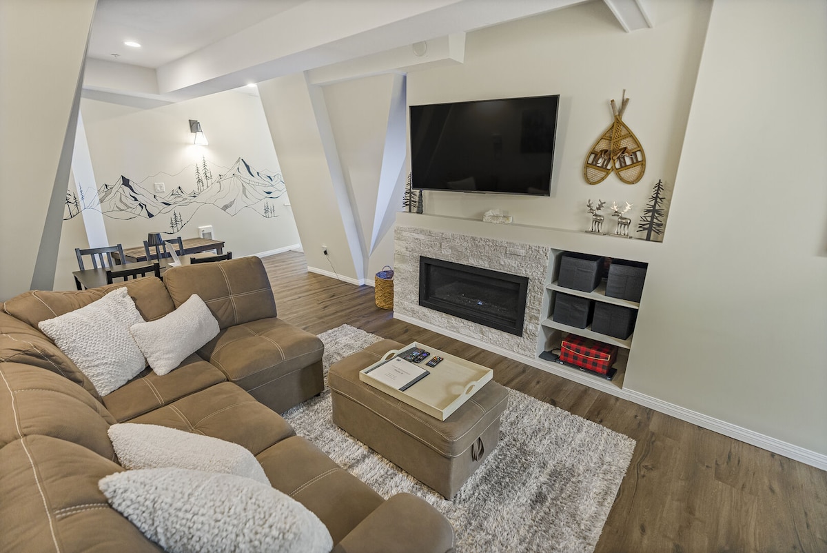 This cozy two-bedroom suite offers a spacious living area with a sofa bed, gas fireplace, and fully equipped kitchen. With convenient access to the mountain, it features a queen bedroom with ensuite and a second bedroom with two bunk beds. Perfect for up to 6 guests. Please note: the hot tub is unavailable during the summer season. Registration Number: ST917009790